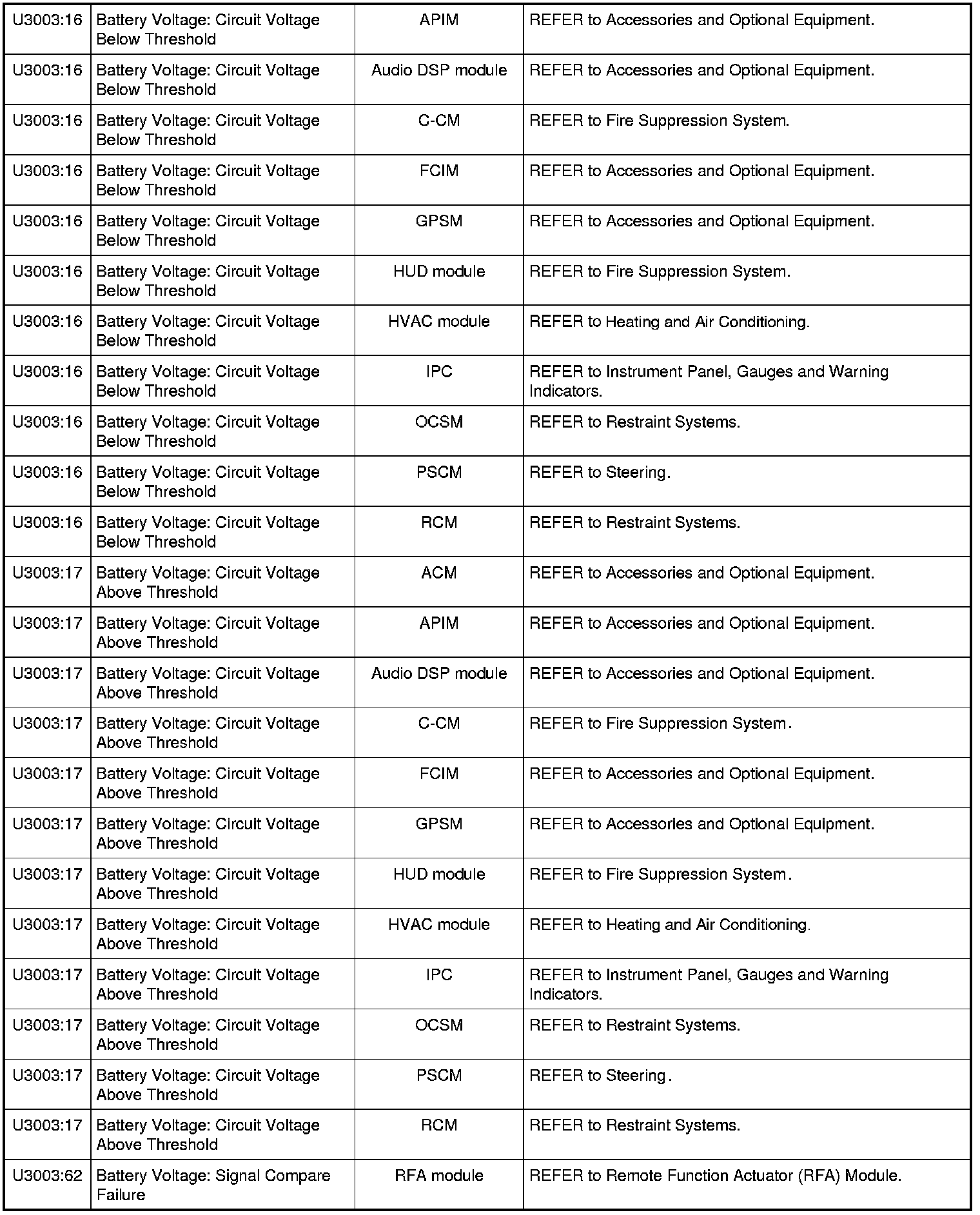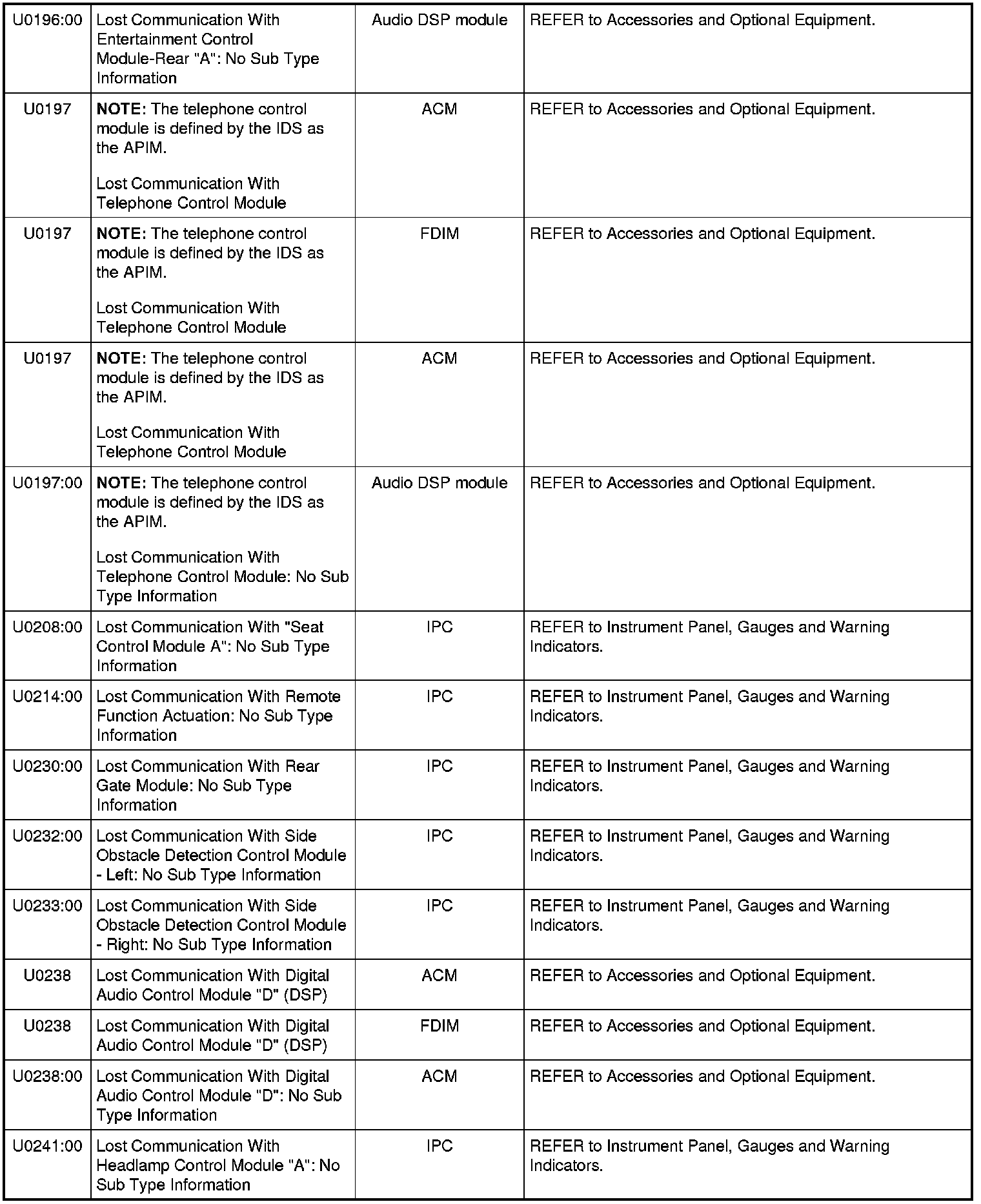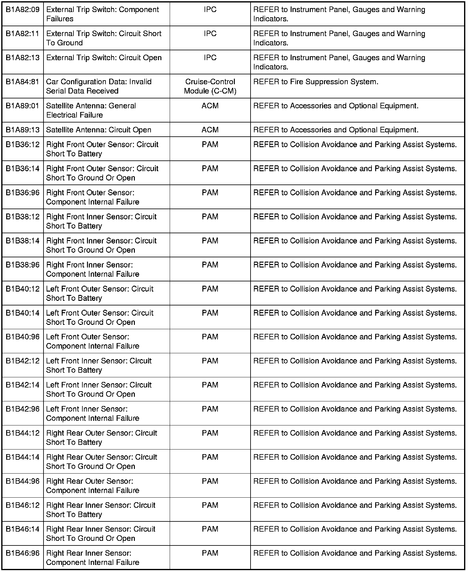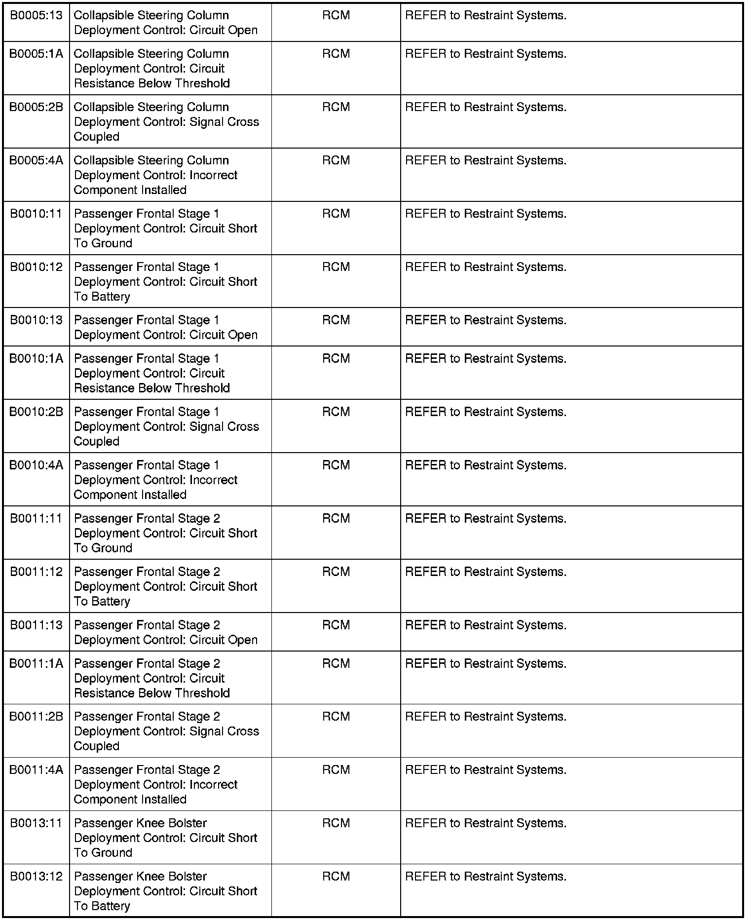 Home >> Ford >> 2010 >> Taurus AWD V6-3.5L >> Repair and Diagnosis >> Body and Frame >> Body Control Systems >> Testing and Inspection >> Diagnostic Trouble Code Descriptions >> Diagnostic Trouble Code (DTC) Chart