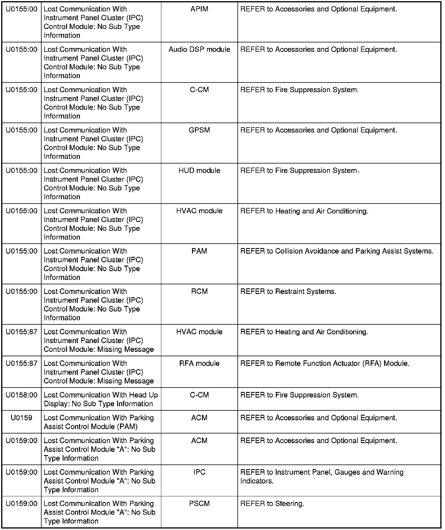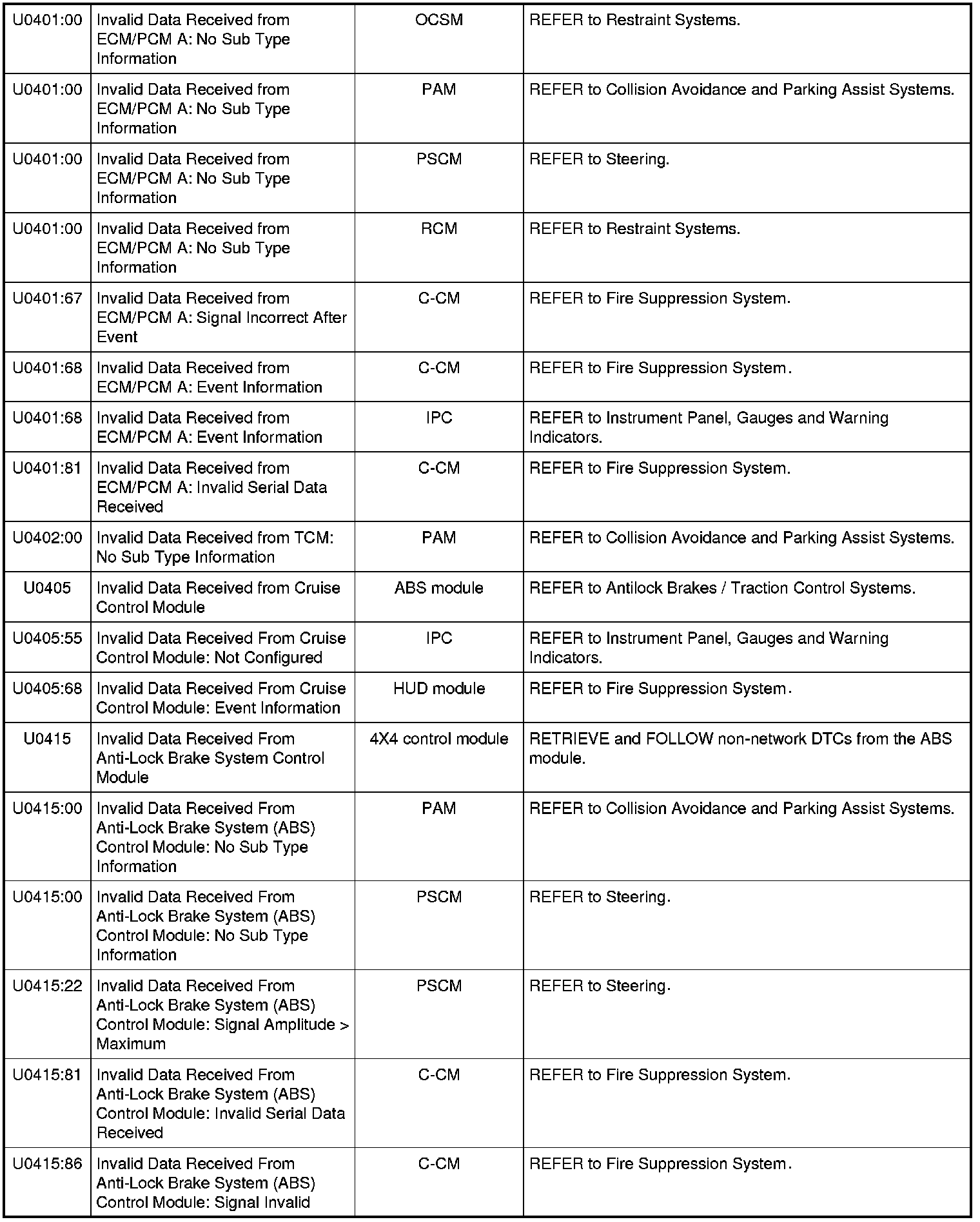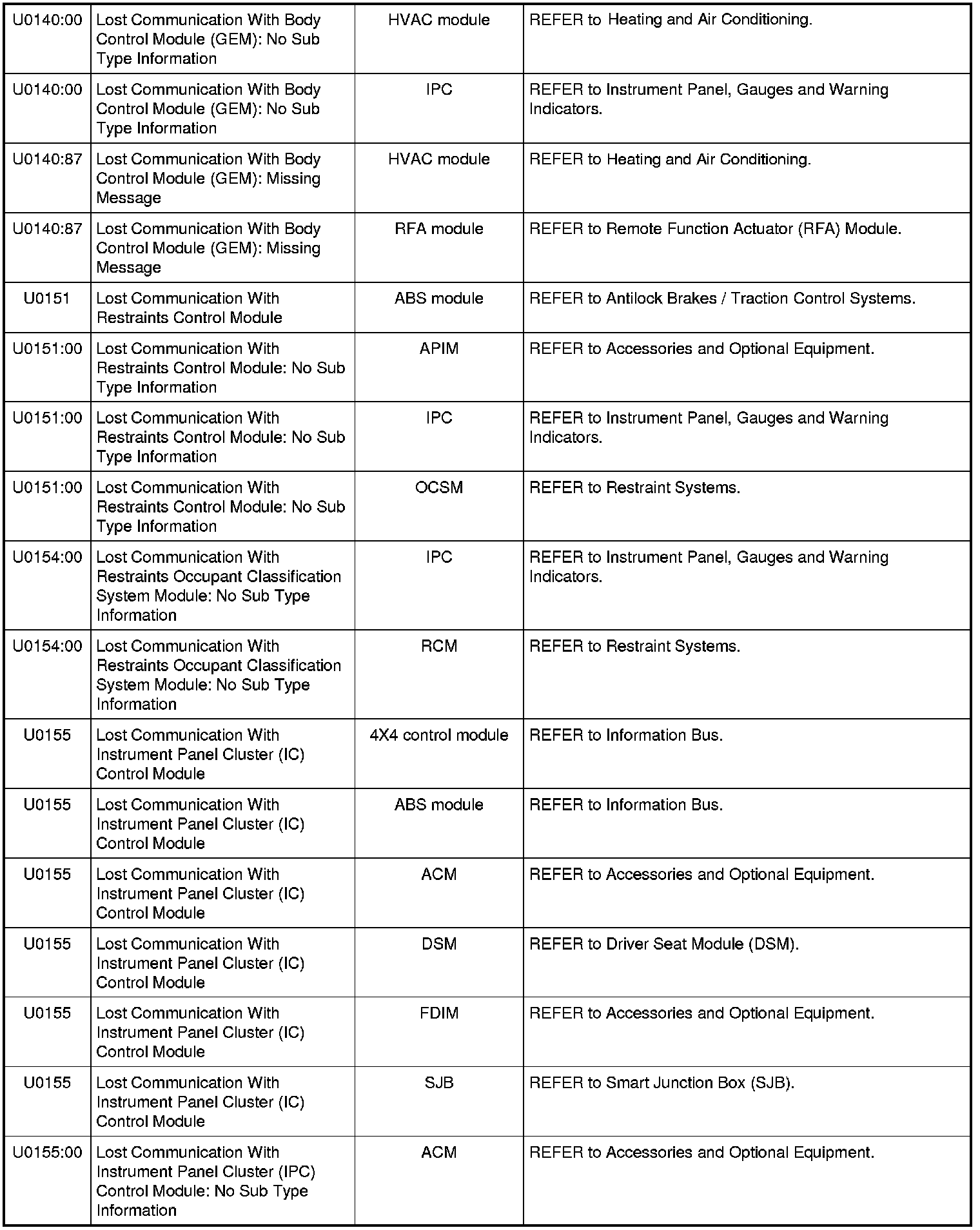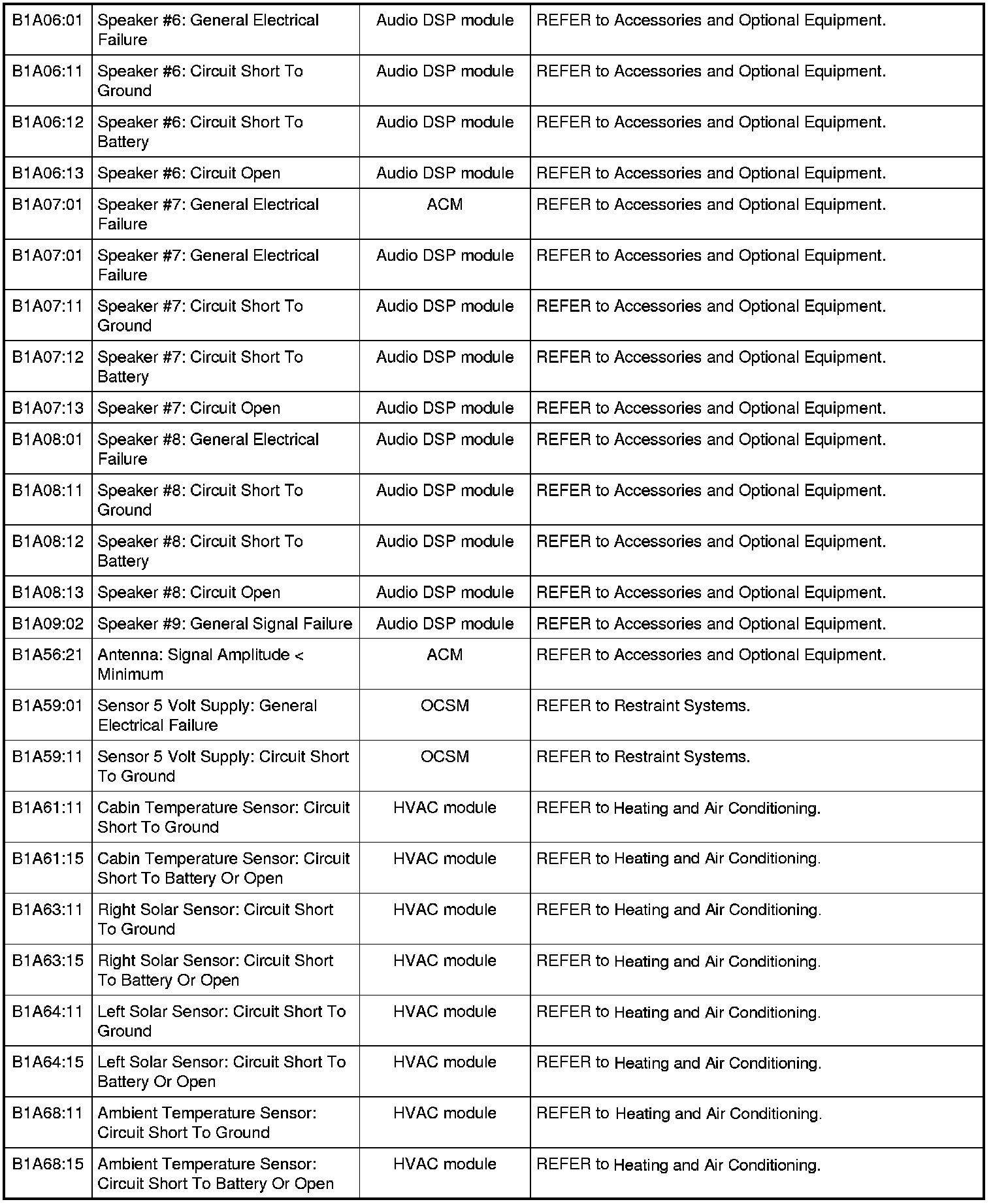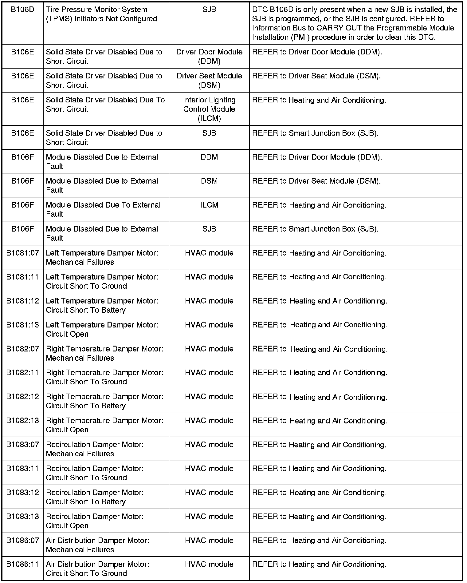 Home >> Ford >> 2010 >> Taurus AWD V6-3.5L >> Repair and Diagnosis >> Body and Frame >> Body Control Systems >> Testing and Inspection >> Diagnostic Trouble Code Descriptions >> Diagnostic Trouble Code (DTC) Chart