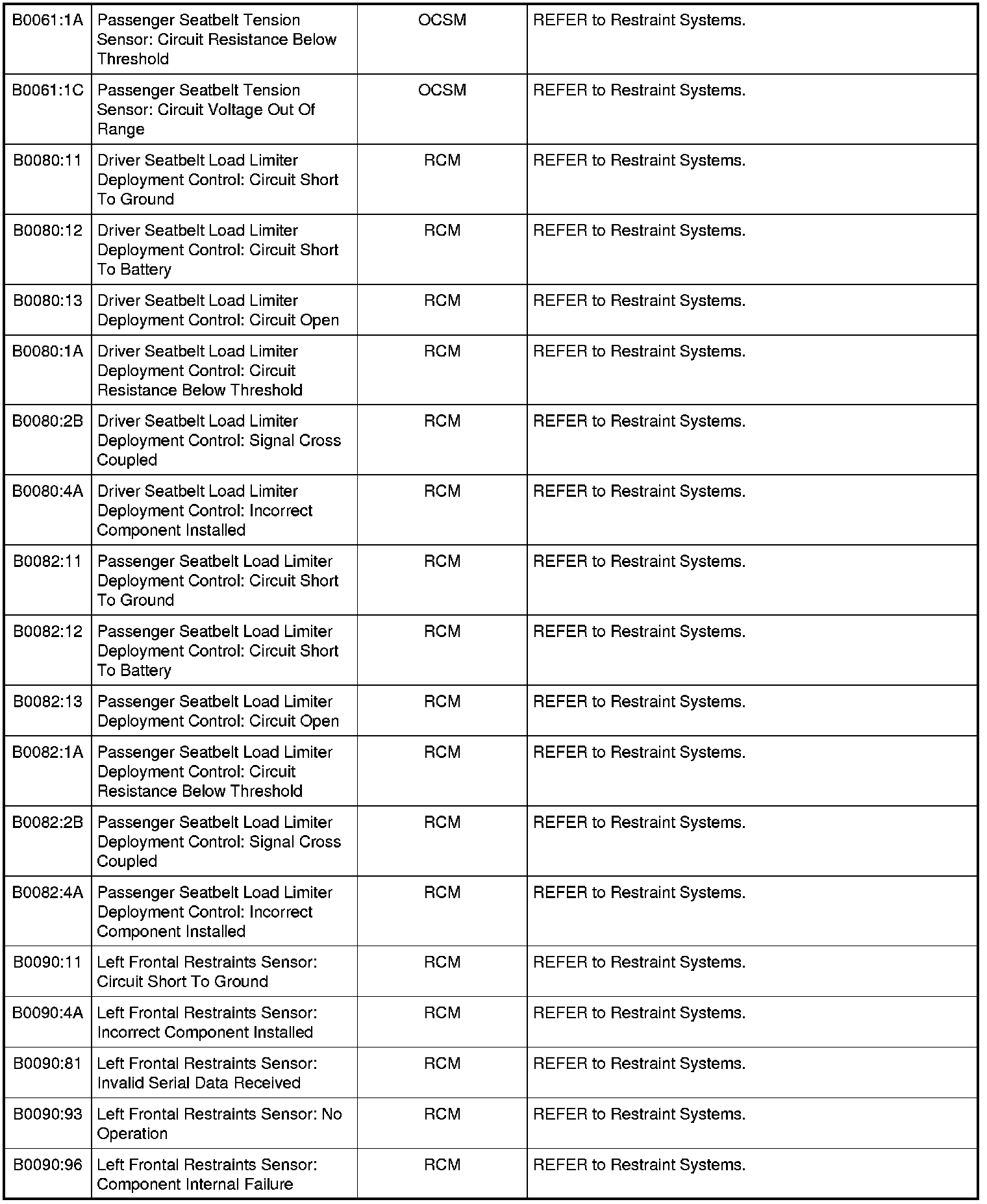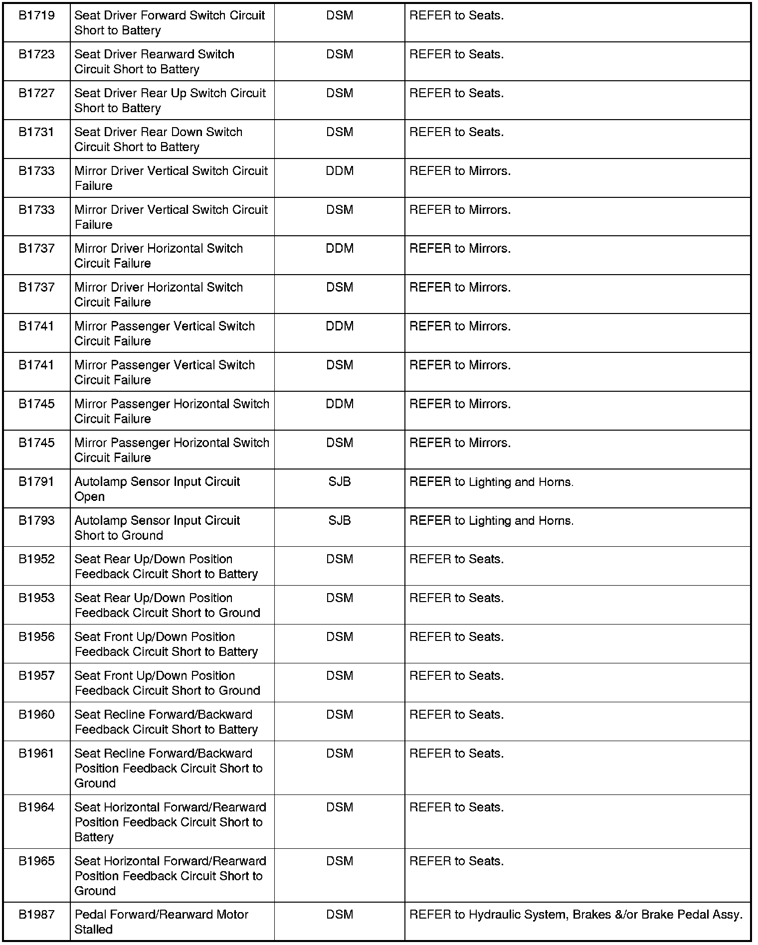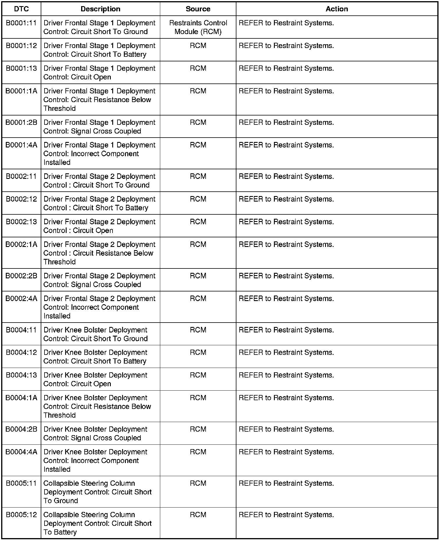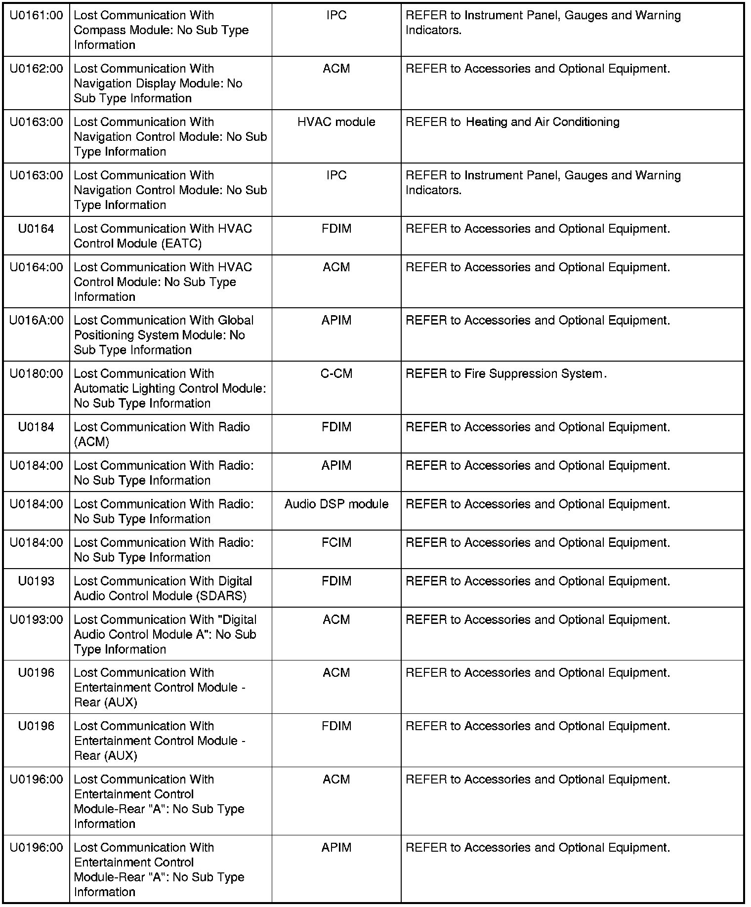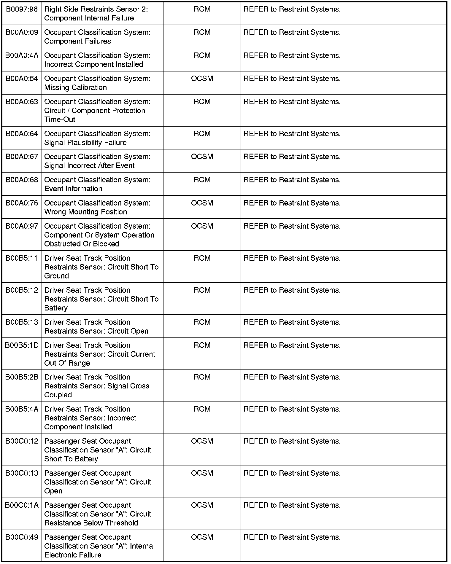 Home >> Ford >> 2010 >> Taurus AWD V6-3.5L >> Repair and Diagnosis >> Body and Frame >> Body Control Systems >> Testing and Inspection >> Diagnostic Trouble Code Descriptions >> Diagnostic Trouble Code (DTC) Chart