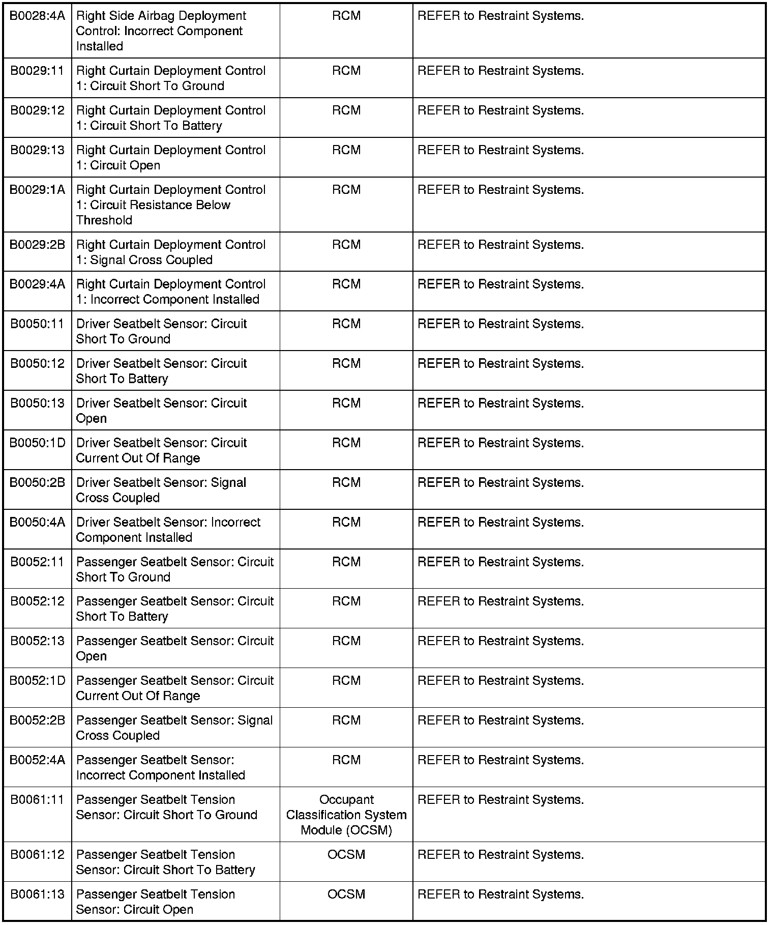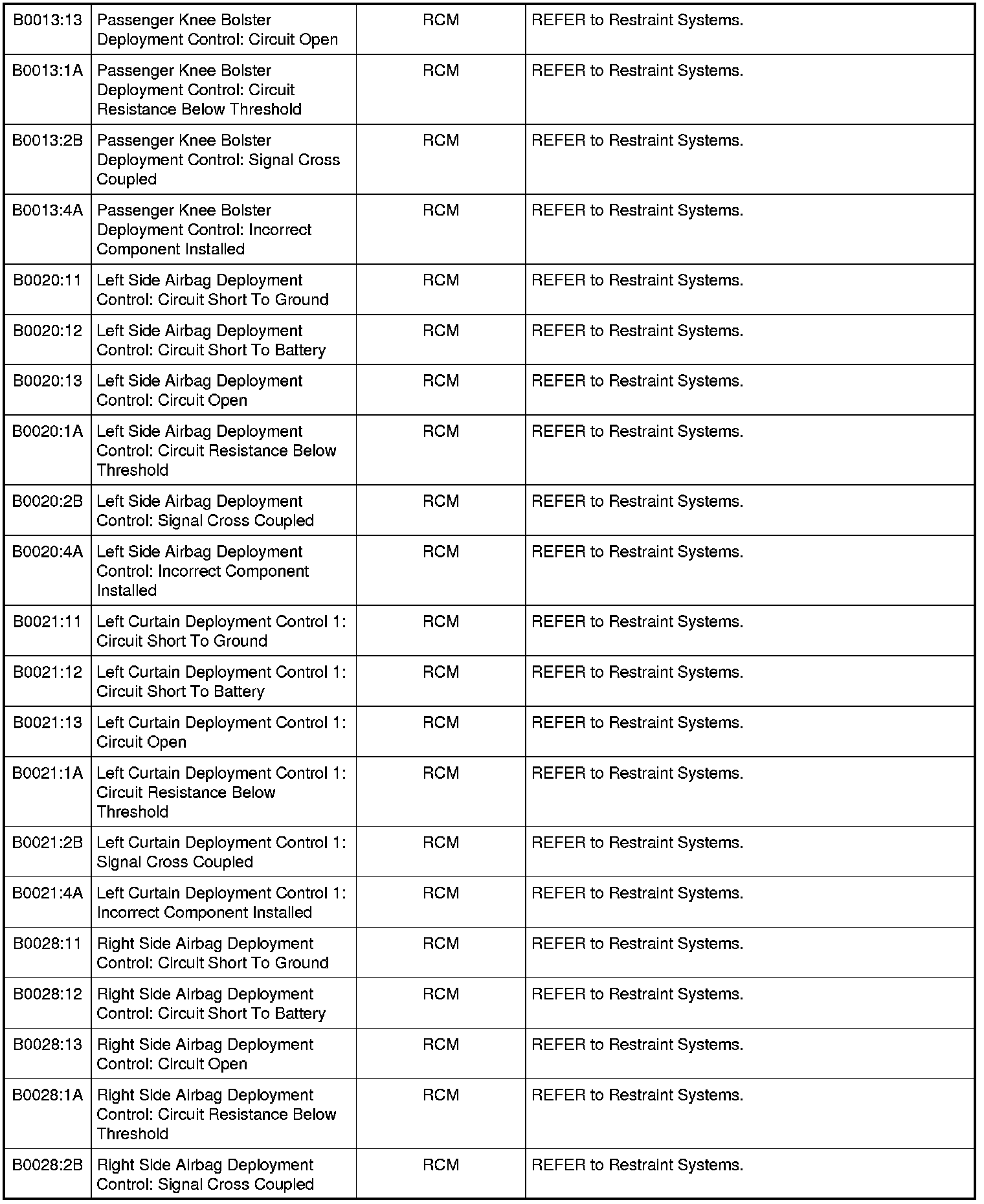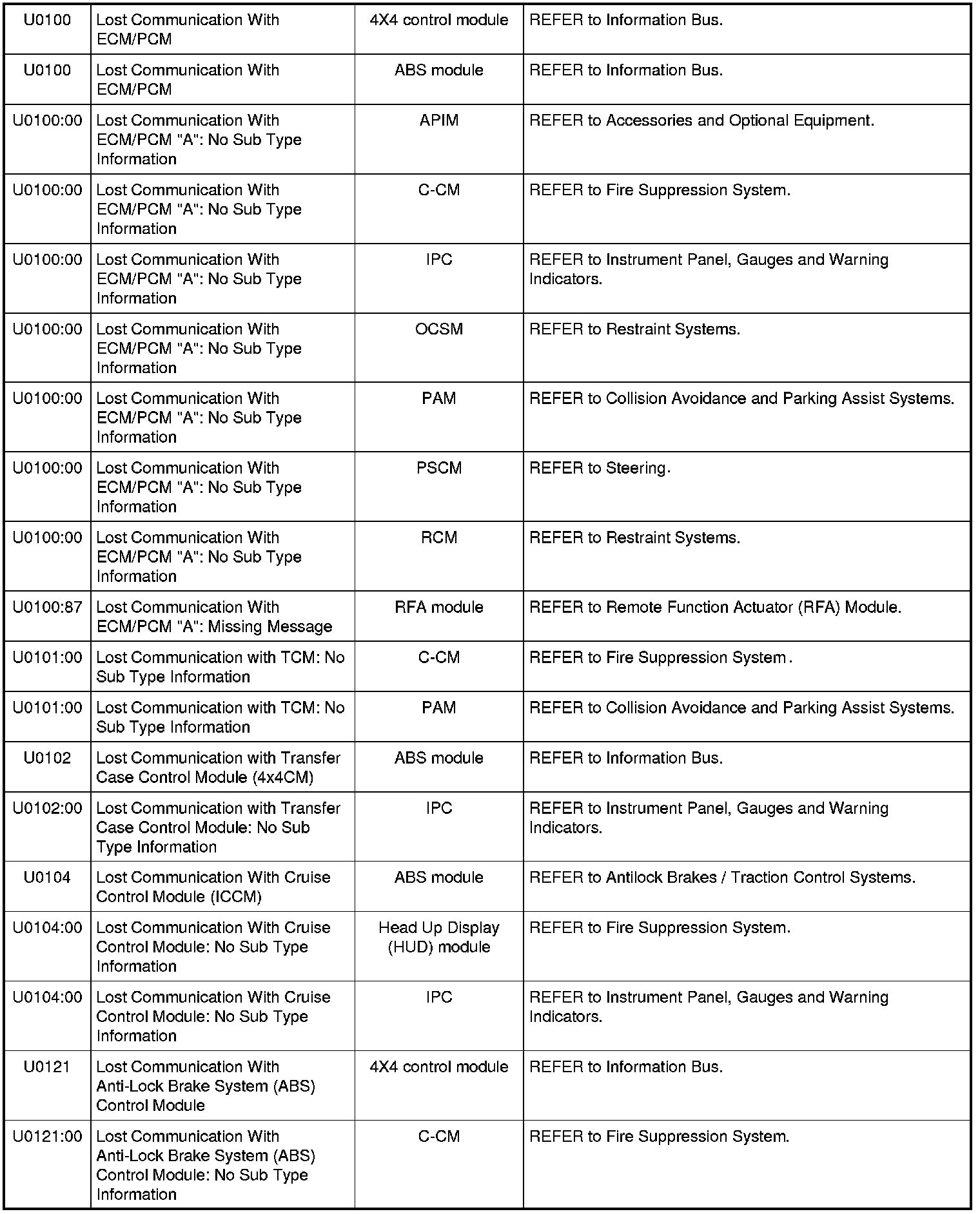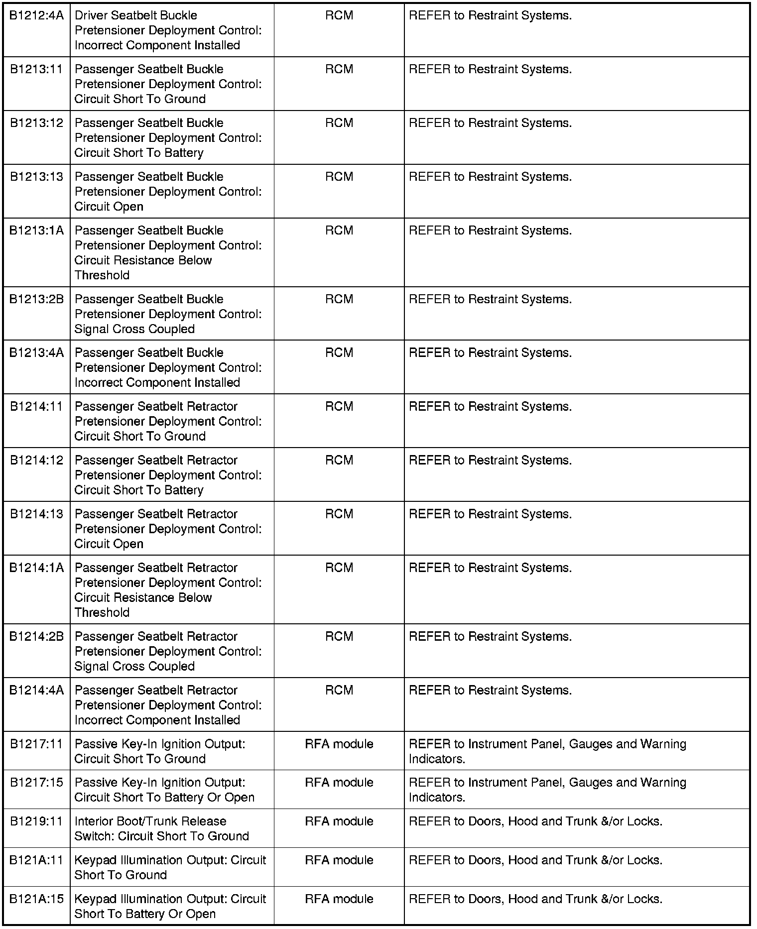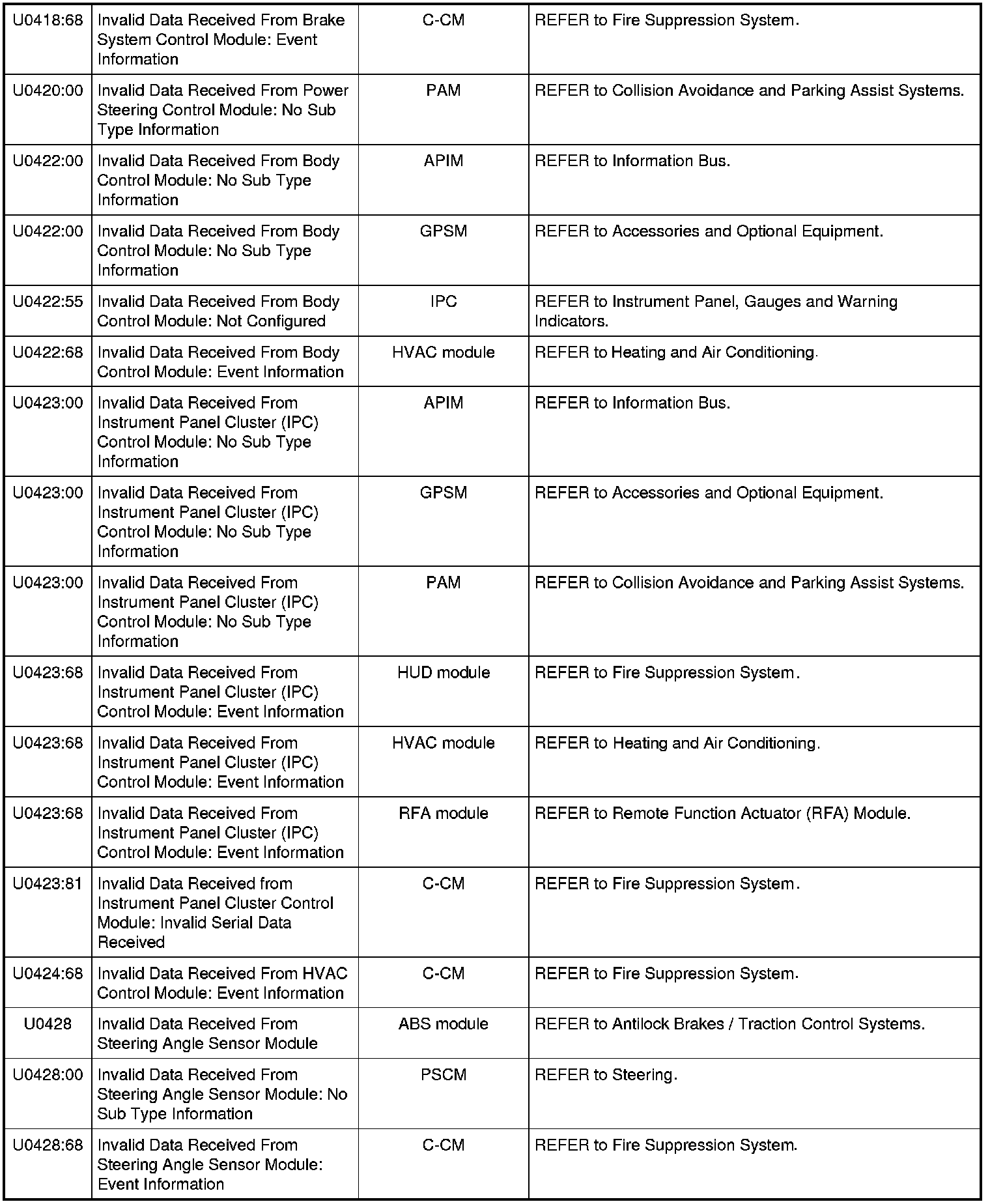 Home >> Ford >> 2010 >> Taurus AWD V6-3.5L >> Repair and Diagnosis >> Body and Frame >> Body Control Systems >> Testing and Inspection >> Diagnostic Trouble Code Descriptions >> Diagnostic Trouble Code (DTC) Chart