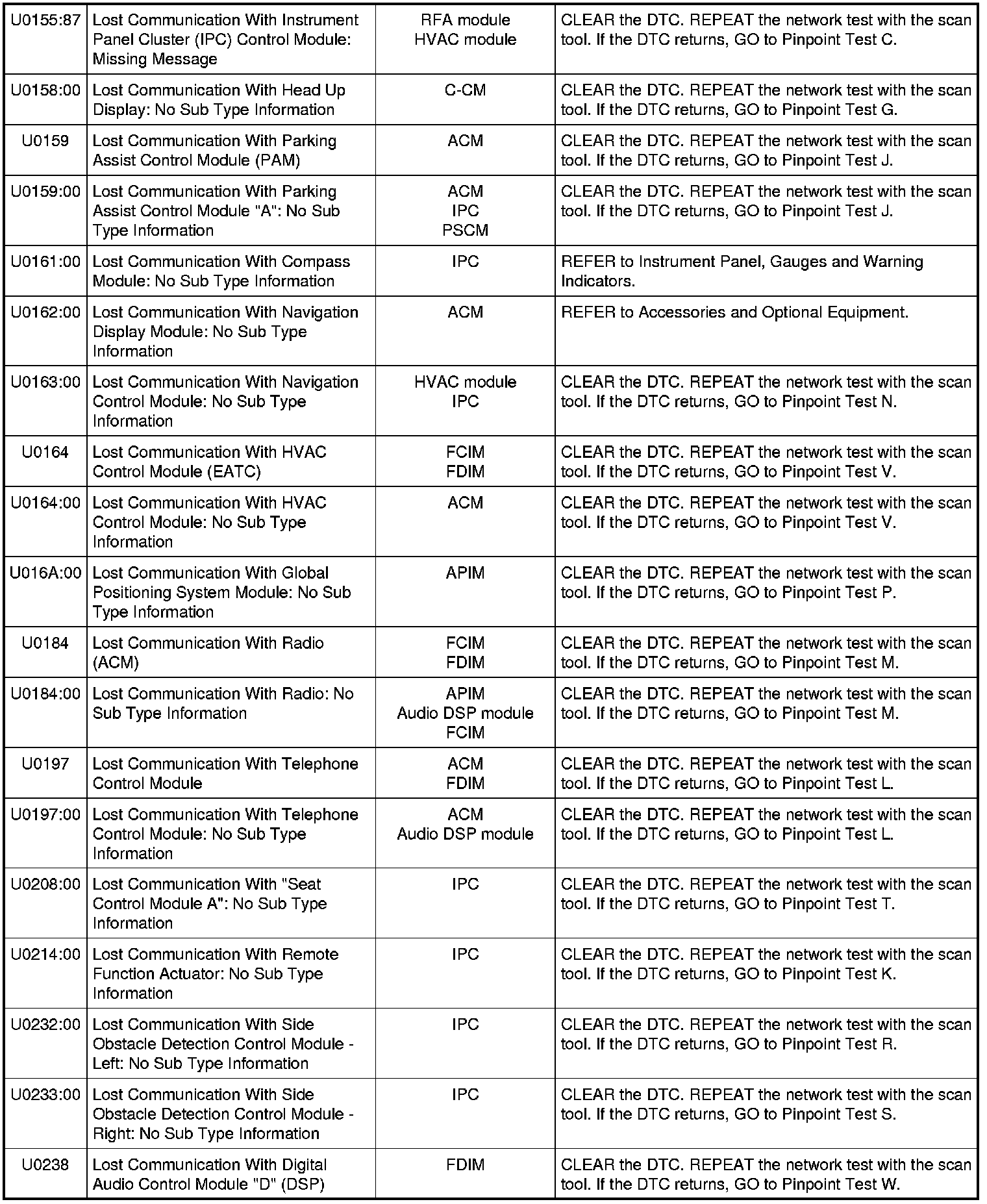 NOTE: Network DTCs (U-codes) are often a result of intermittent concerns such as damaged wiring or low battery voltage occurrences. Additionally, vehicle repair procedures such as module reprogramming often sets network DTCs. Replacing a module to resolve a network DTC is unlikely to resolve the concern. To prevent repeat network DTC concerns, inspect all network wiring, especially connectors. Test the vehicle battery, refer to Battery.
