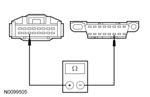 - Measure the resistance between the 4X4 control module C281-3, circuit VDB04 (WH/BU), harness side and the Data Link Connector (DLC) C251-6, circuit VDB04 (WH/BU), harness side.