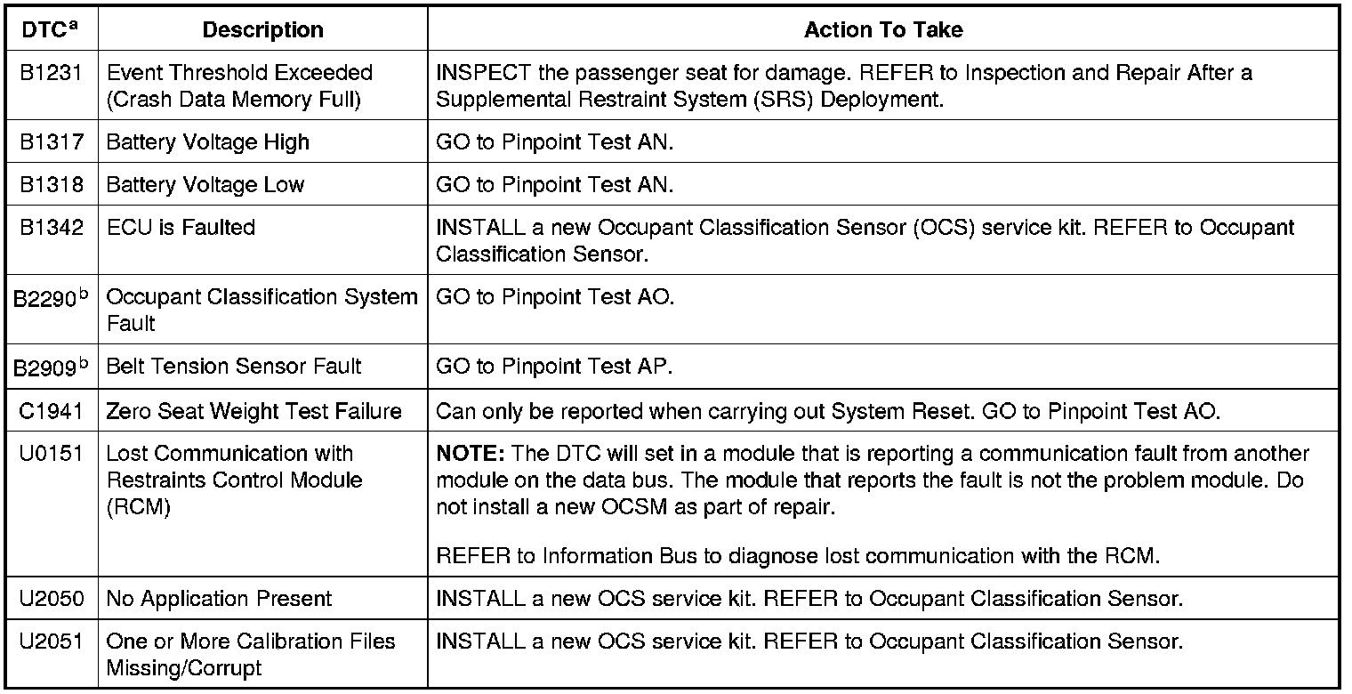 Home >> Ford >> 2010 >> Taurus AWD V6-3.5L >> Repair and Diagnosis >> Restraints and Safety Systems >> Air Bag Systems >> Testing and Inspection >> Diagnostic Trouble Code Tests and Associated Procedures >> Occupant Classification System Module (OCSM) DTC Chart >> Bladder System