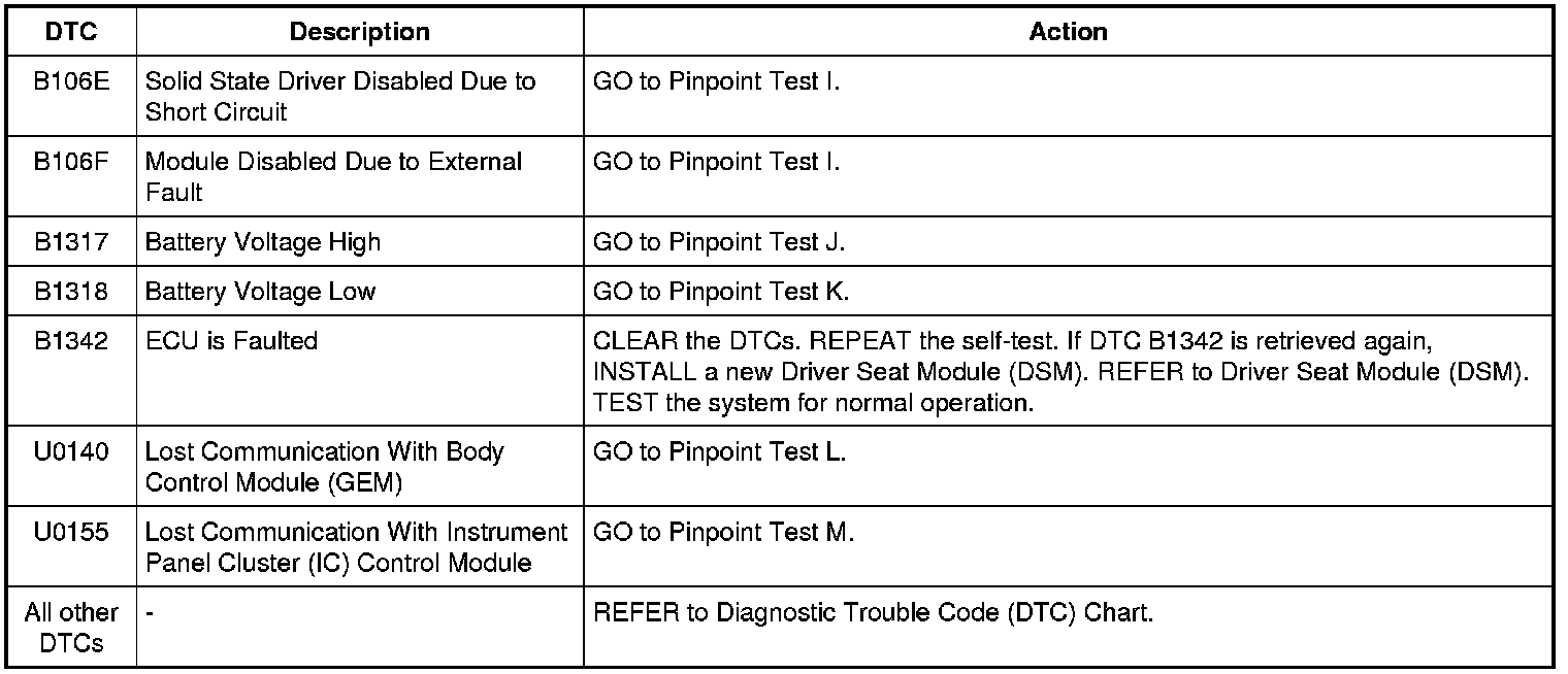 Driver Seat Module (DSM) DTC Chart