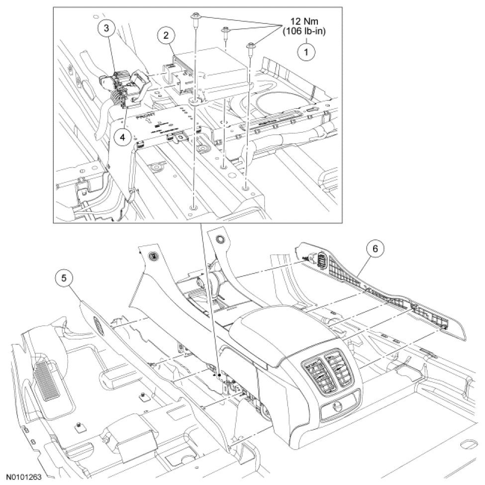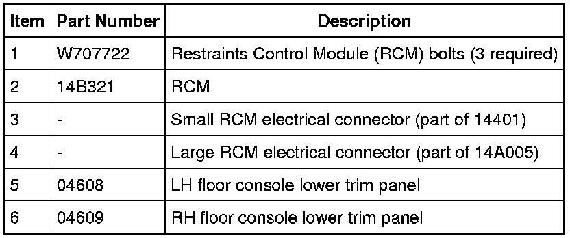 2. WARNING: Always tighten the fasteners of the restraints control module (RCM) and impact sensor (if equipped) to the specified torque. Failure to do so may result in incorrect restraint system operation, which increases the risk of personal injury or death in a crash.