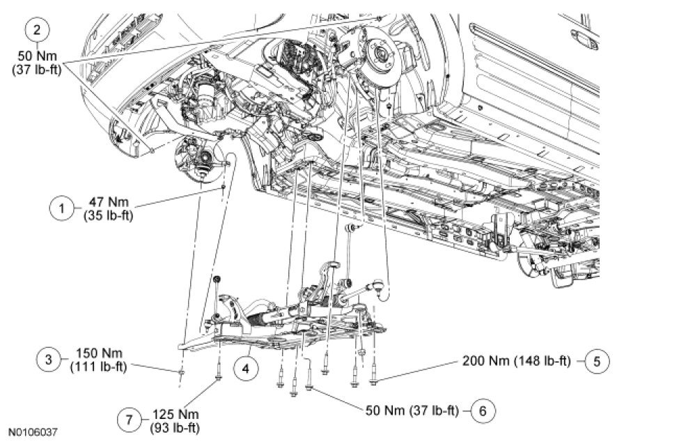 - Tighten the front subframe bolts to 125 Nm (93 lb-ft).
