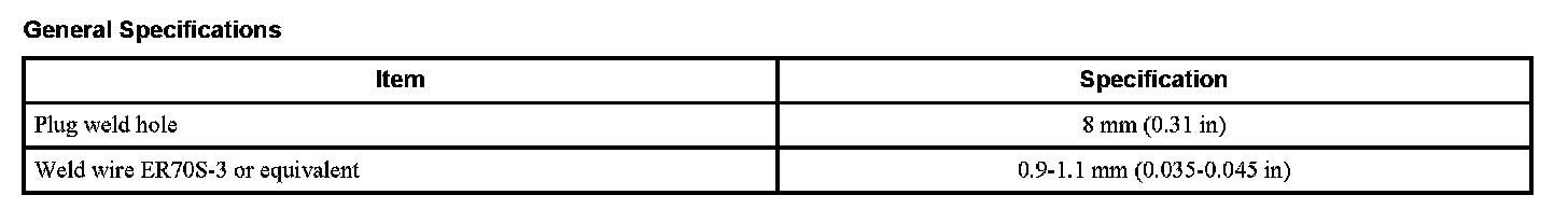 - Factory spot welds may be substituted with either STRW or MIG plug welds. Spot/plug welds should equal factory welds in both location and quantity. Do not place a new spot weld directly over an original weld location. Plug weld hole should equal 8 mm (0.31 in) diameter.