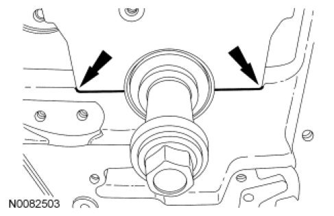 Apply a 2.5 mm (0.09 in) bead of silicone gasket and sealant to the oil pan-to-engine block and to the oil pan-to-engine front cover mating surface.