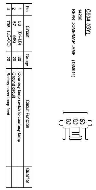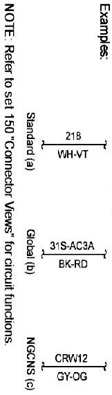 Connector Views show the views of the pins and/or cavities of all connectors. The pin and cavity sides are shown separately as if the connector were disconnected. The color of the connector housing is indicated next to the connector number when available. The harness causal number is located above the connector view and below the connector number. The circuit function charts are located below each connector. The wiring harness designations are listed in Component Location Charts.