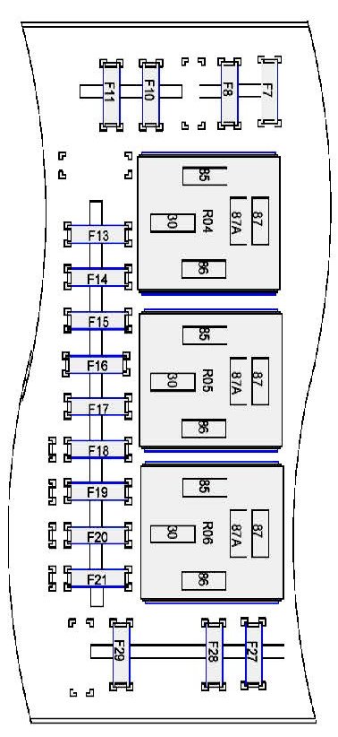Fuse/Locations and Relay/Locations contains a view of the fuse/relay box, in which fuses and relays are identified, numbered and named. Fuse and relay numbering and naming follow the indication of the fuse panel cover. In addition, for all removable relays, pin positions are added to illustrate proper orientation.