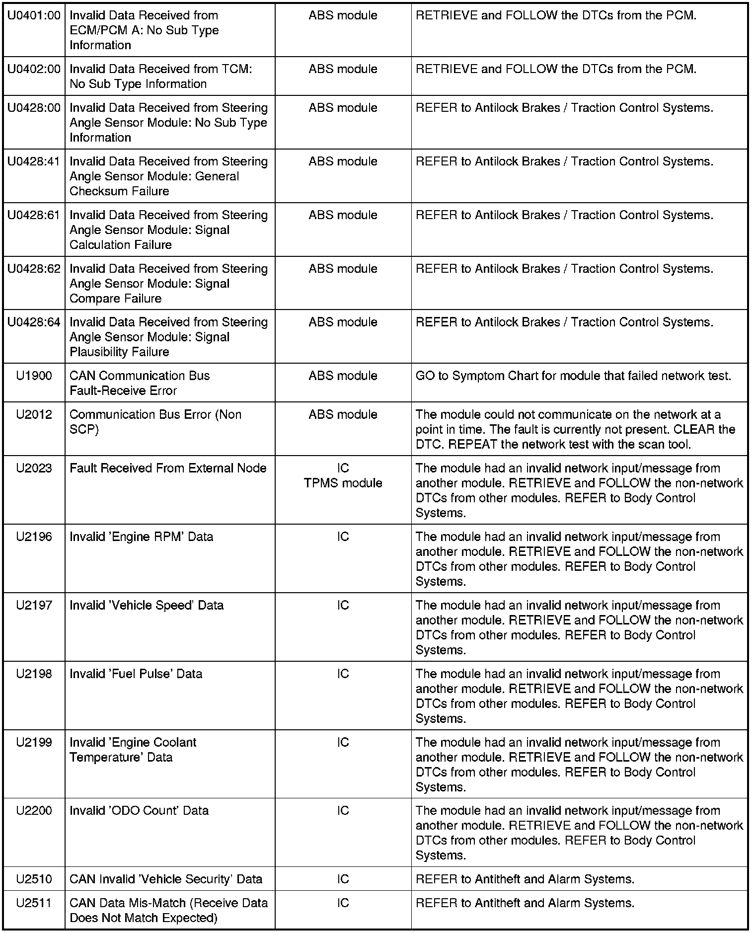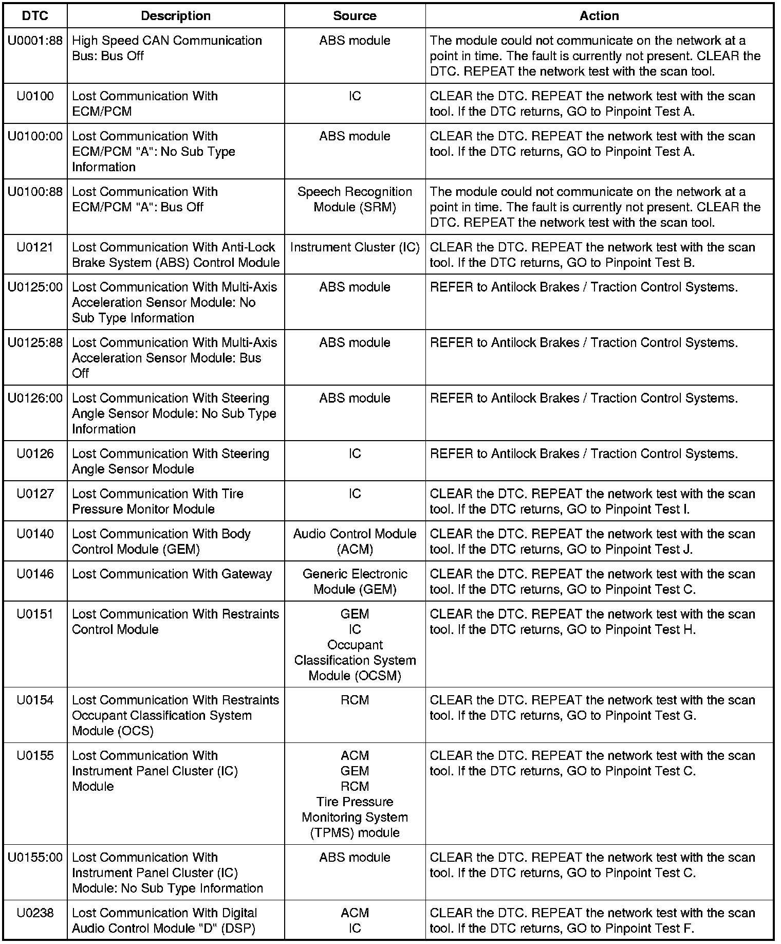 NOTE: Network DTCs (U-codes) are often a result of intermittent concerns such as damaged wiring or low battery voltage occurrences. Additionally, vehicle repair procedures such as module reprogramming often set network DTCs. Replacing a module to resolve a network DTC is unlikely to resolve the concern. To prevent repeat network DTC concerns, inspect all network wiring, especially connectors. Test the vehicle battery, refer to Battery.