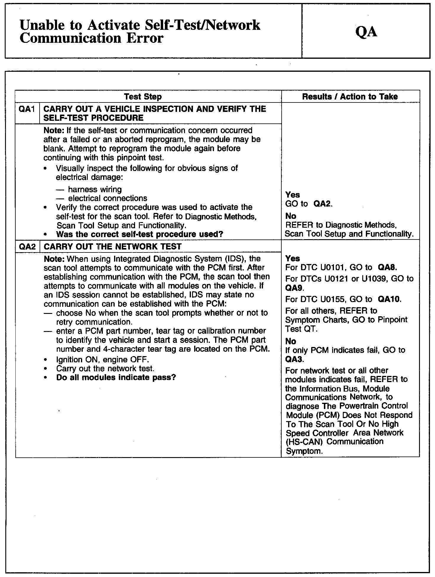 Home >> Ford >> 2010 >> Transit Connect L4-2.0L >> Repair and Diagnosis >> Powertrain Management >> Computers and Control Systems >> Testing and Inspection >> Pinpoint Tests >> Test QA: Unable To Activate Self-Test/Network Communication Error