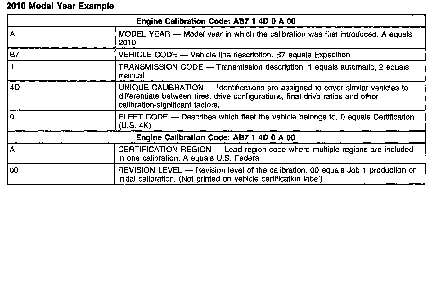 Base engine calibration information, sometimes referred to as the powertrain calibration, is located in the lower right corner of the vehicle certification label. Engine calibration information is limited to a maximum of 5 characters per line (2 lines maximum). Calibration information more than 5 characters long wraps to the second line of this field. Only the base calibration appears on this label. The revision level is no longer printed on the label. However, it can be found in the On-Line Automotive Service Information System (OASIS). For additional information on the vehicle certification label or engine calibration, refer to the Vehicle/Application and ID, Identification Codes.