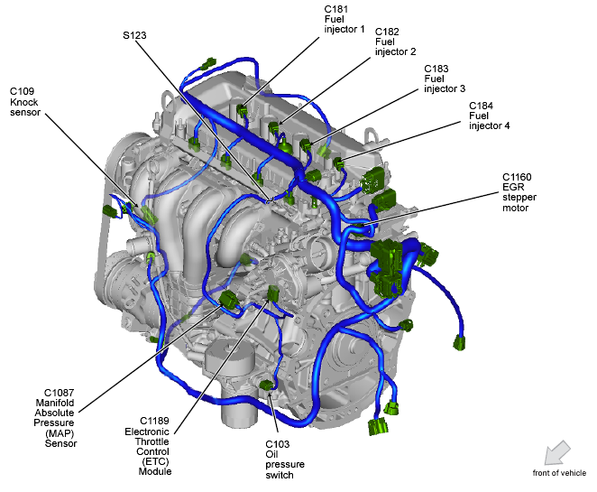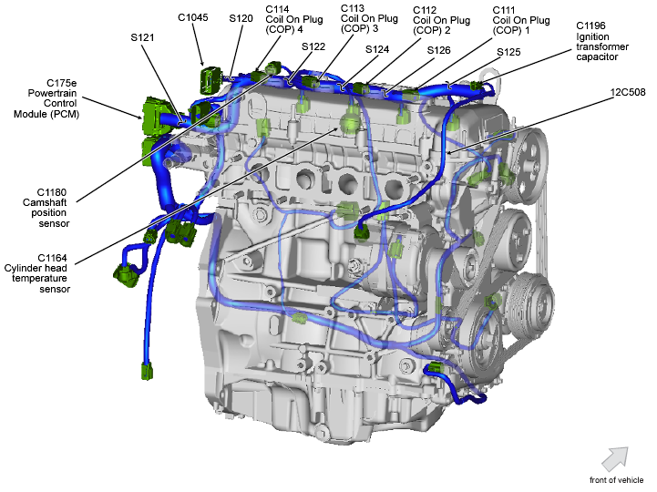 | Powertrain Control Module (PCM) | Rear of engine. See Figure. |