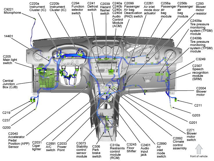 | Speech Recognition Module (SRM) | Right end of dash. See Figure. |