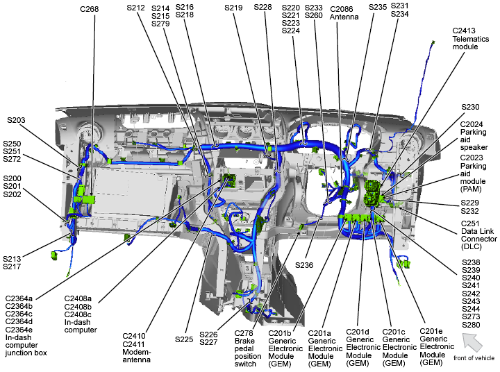 | Parking Aid Module (PAM) | Left end of dash. See Figure. |