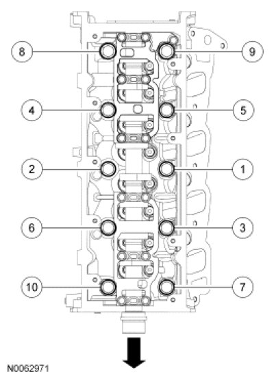 Tighten the 10 RH cylinder head bolts in 6 stages, in the sequence shown.