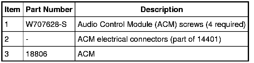 NOTE: It is not necessary to remove the Audio Control Module (ACM) to retrieve the part number. For additional information, refer to Audio Control Module (ACM) Self-Diagnostic Mode Audio Control Module (ACM) Self-Diagnostic Mode.