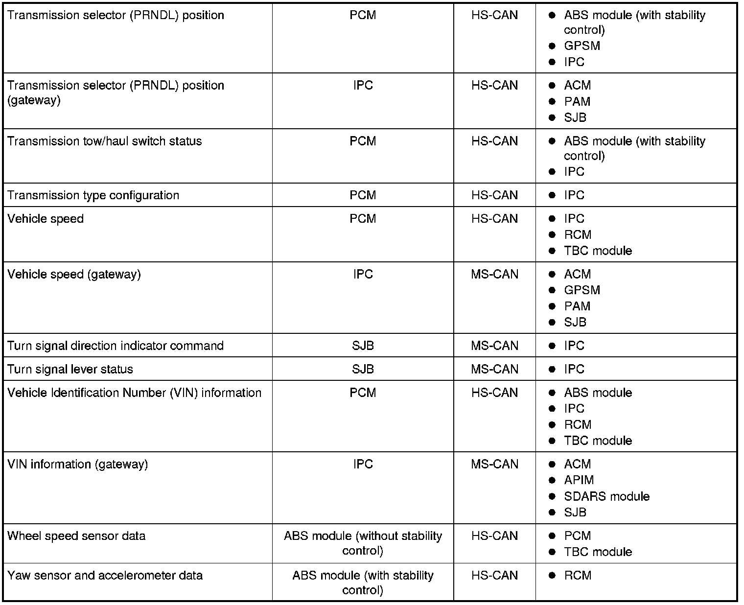 Modules on the CAN utilize simultaneous communication of two or more messages on the same network circuits. The following chart summarizes the messages sent and received on the network.