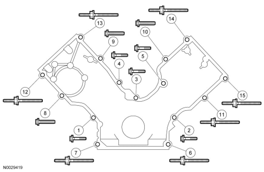 Tighten the 15 engine front cover fasteners in 3 stages, in the sequence shown.