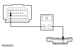 - Measure the resistance between the RCM (Restraints Control Module) C310B-9, circuit VDB05 (WH), harness side and the DLC (Data Link Connector) C251-14, circuit VDB05 (WH), harness side.