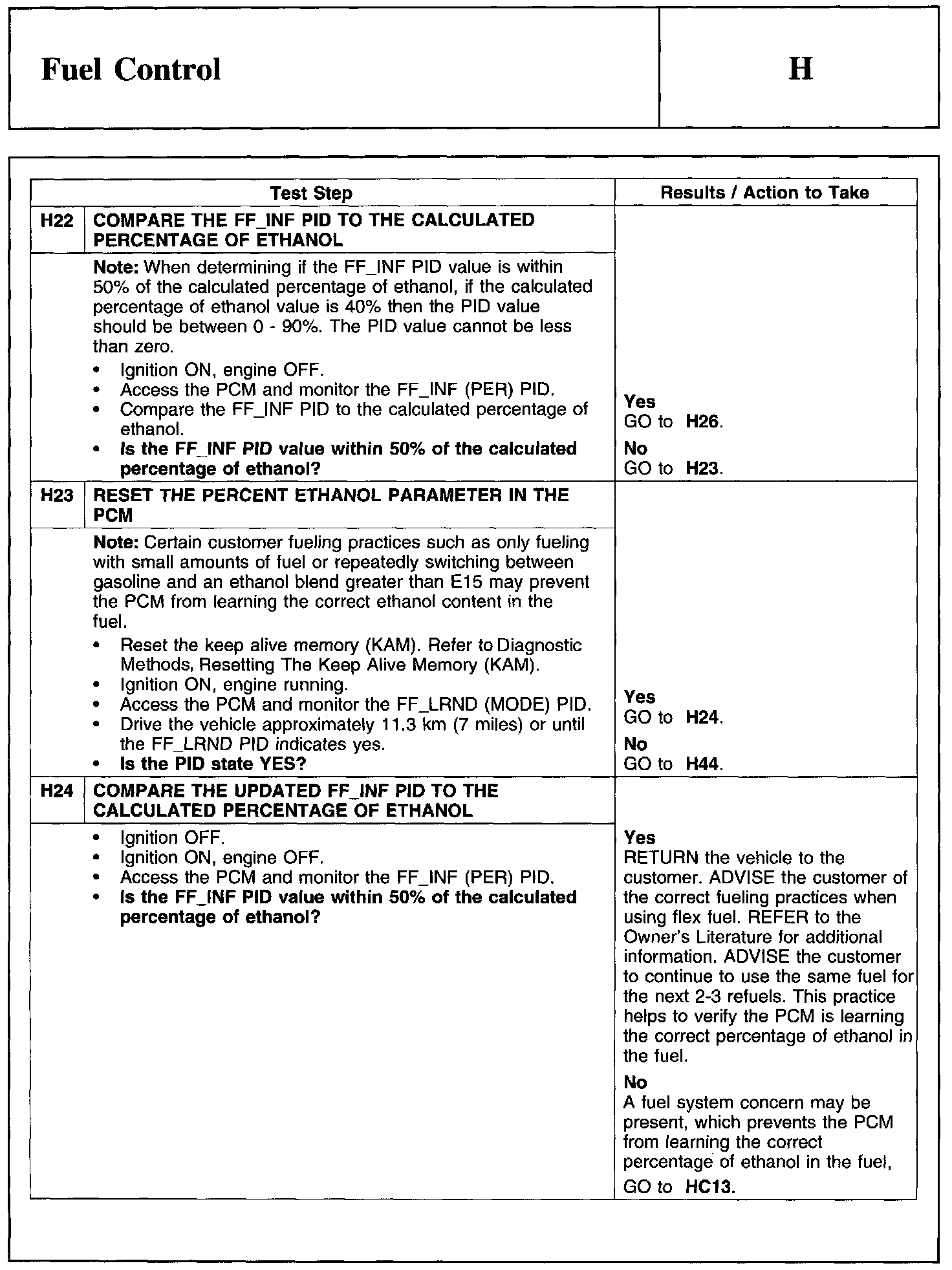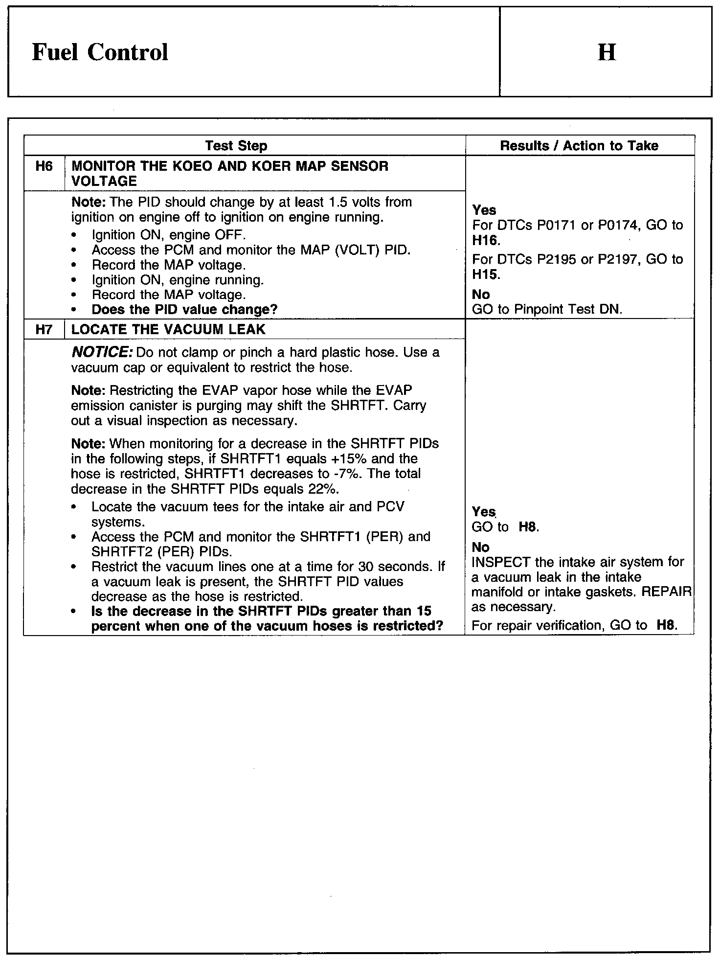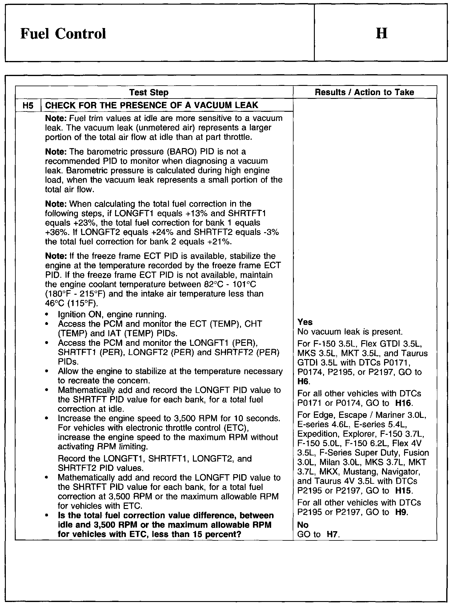 Home >> Ford >> 2011 >> Edge AWD V6-3.5L >> Repair and Diagnosis >> Powertrain Management >> Computers and Control Systems >> Testing and Inspection >> Pinpoint Tests >> Test H: Fuel Control