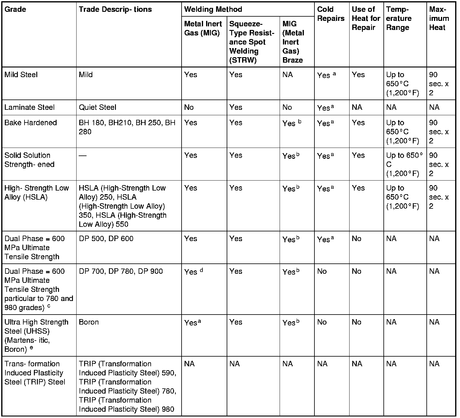 b MIG braze allowed for non-structural applications only.