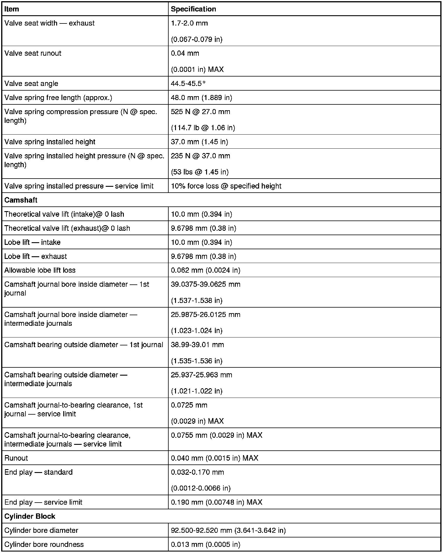 Camshaft Gear/Sprocket Specifications