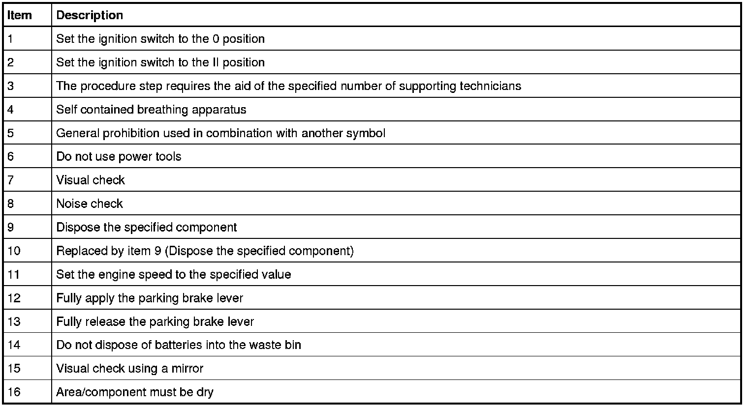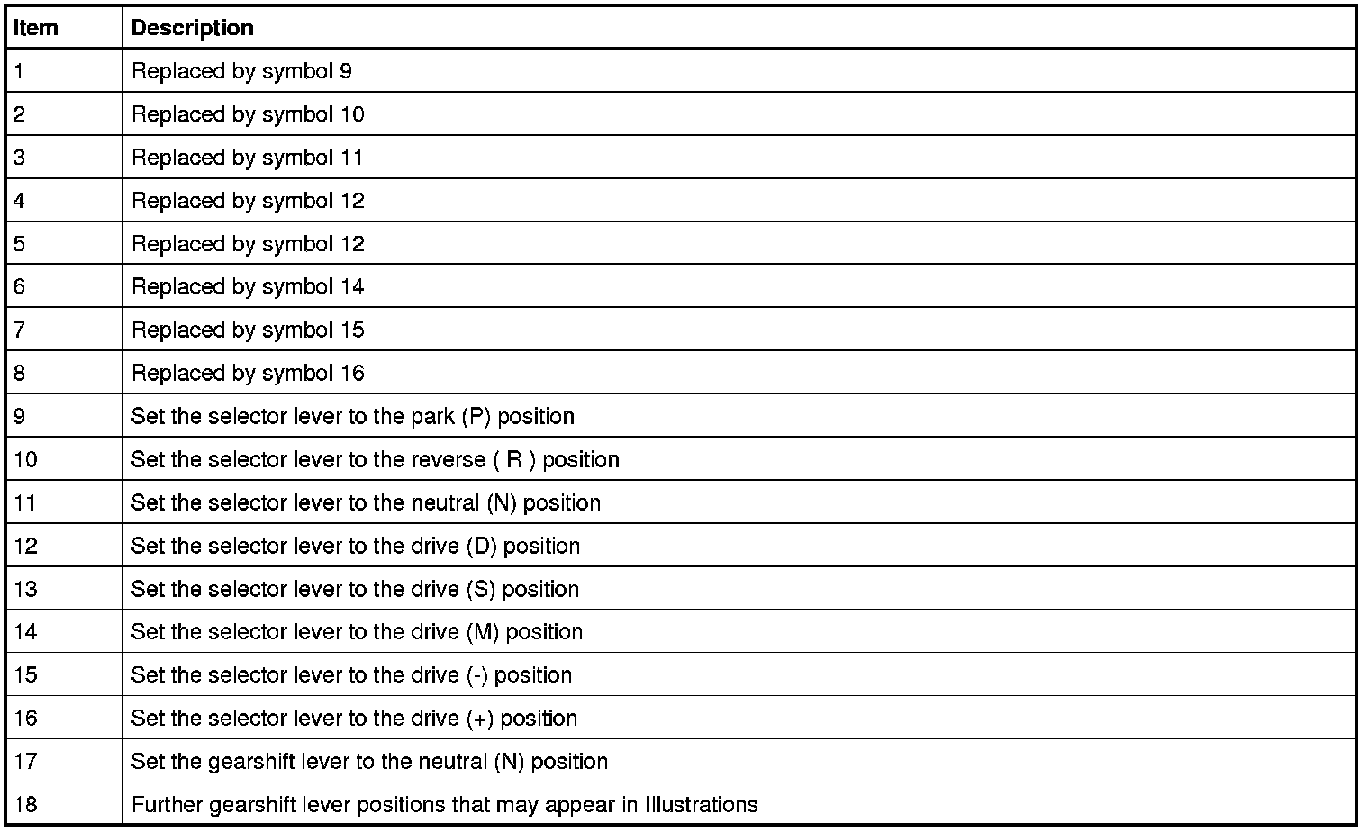 Gearshift lever and selector lever position symbols are used to show the lever position that is required to be selected to carry out a procedure step.
