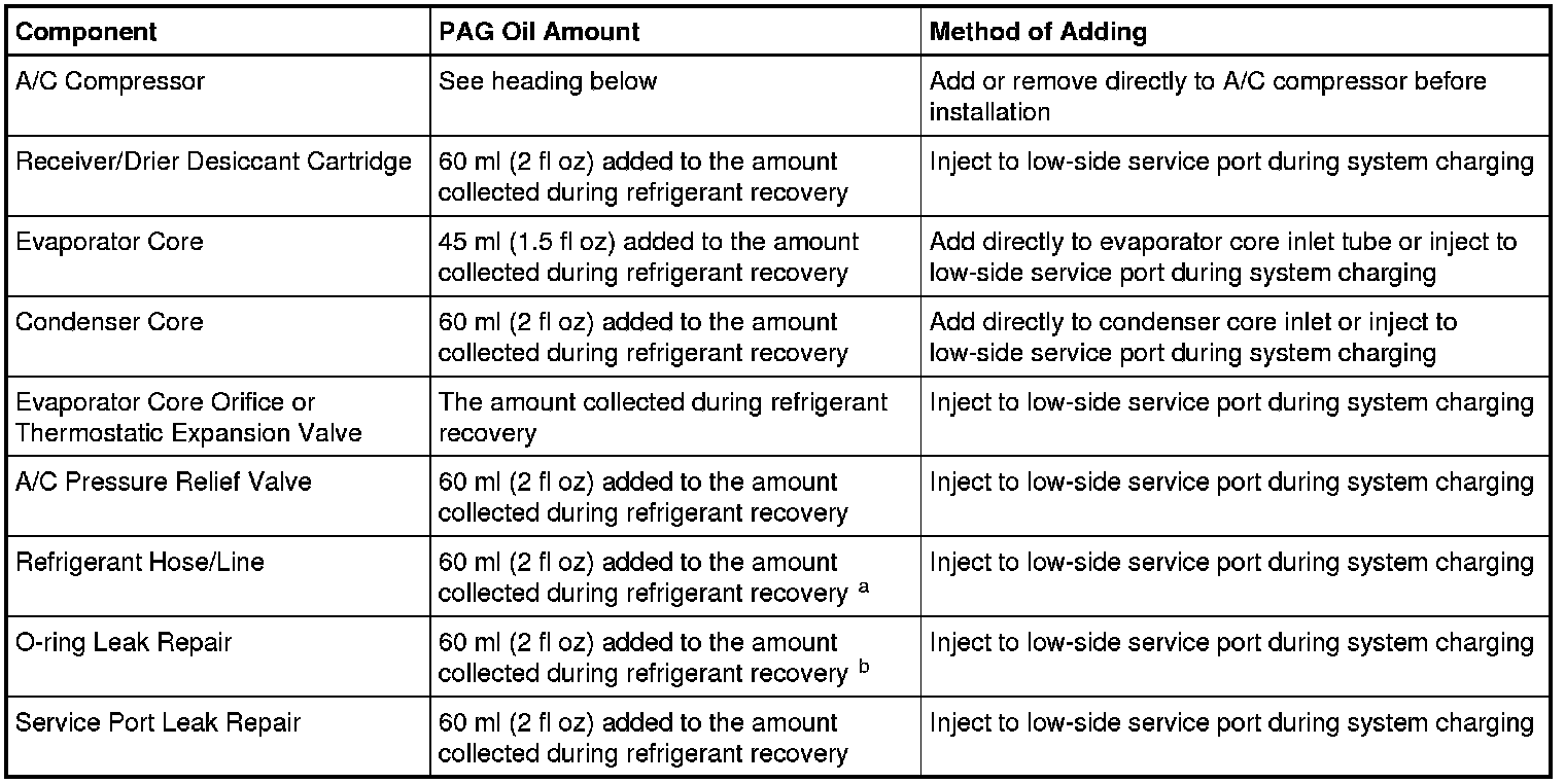 b The amount specified may be used for one or multiple O-ring leak repairs. Do not multiply the refrigerant oil amount by the number of O-ring leaks being repaired.