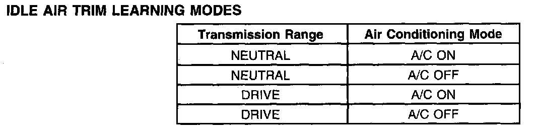 Once the KAM has been reset, the engine must idle for 15 minutes (actual time varies between strategies) to learn new idle air trim values. Idle quality improves as the strategy adapts. Adaptation occurs in 4 separate modes as shown in the following table.