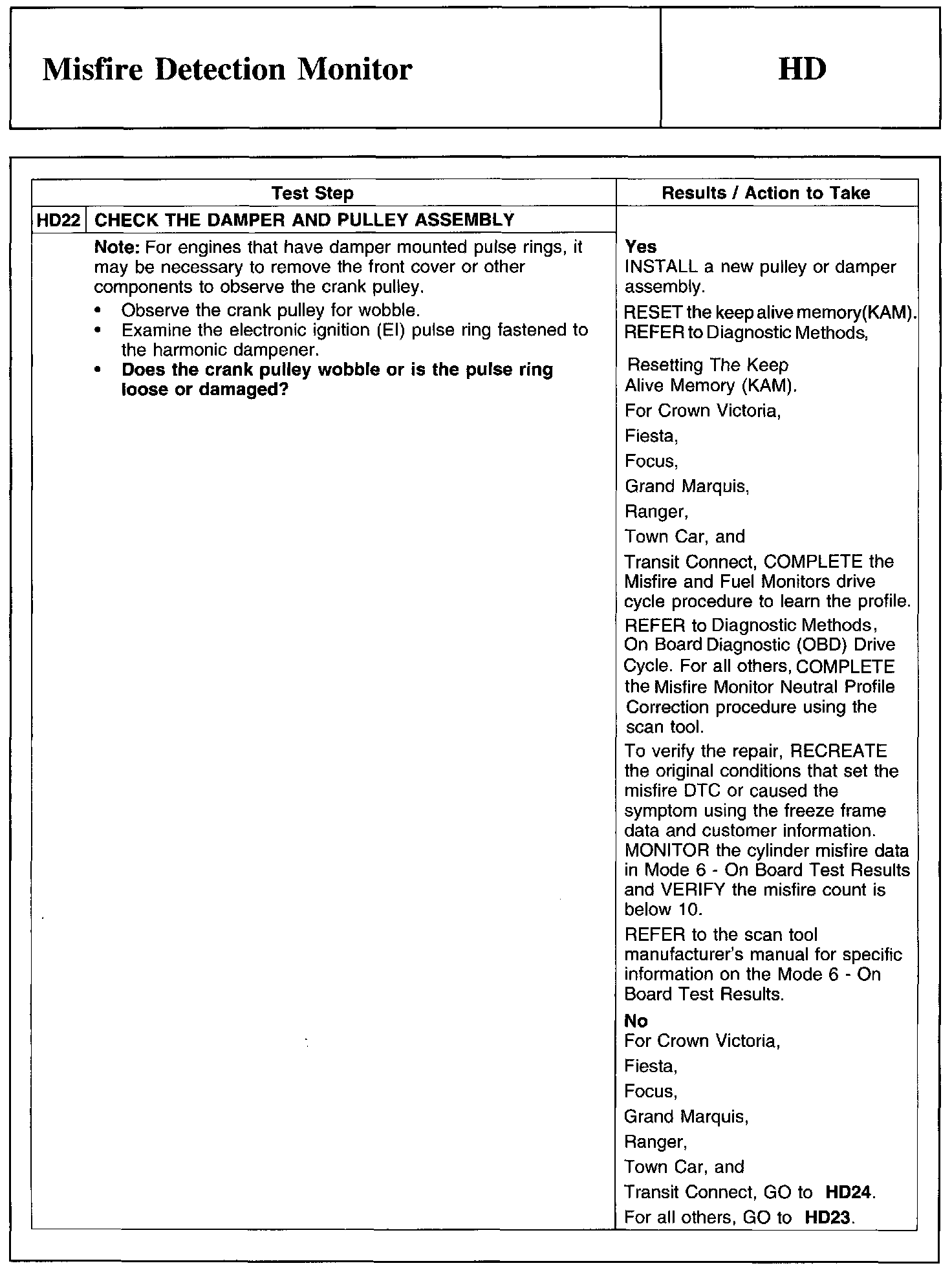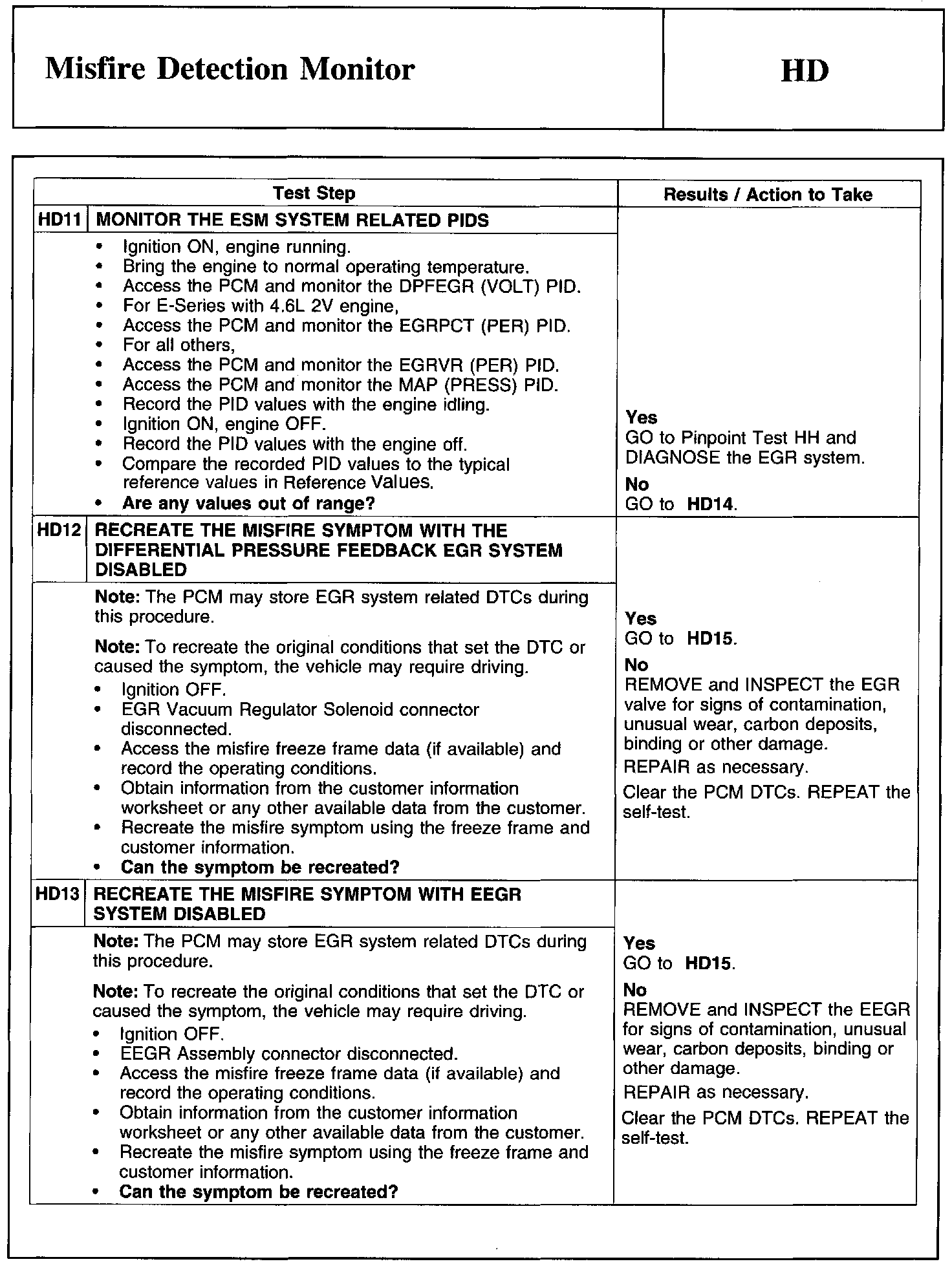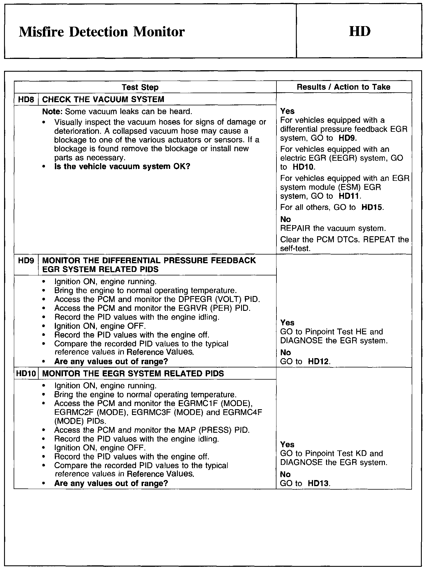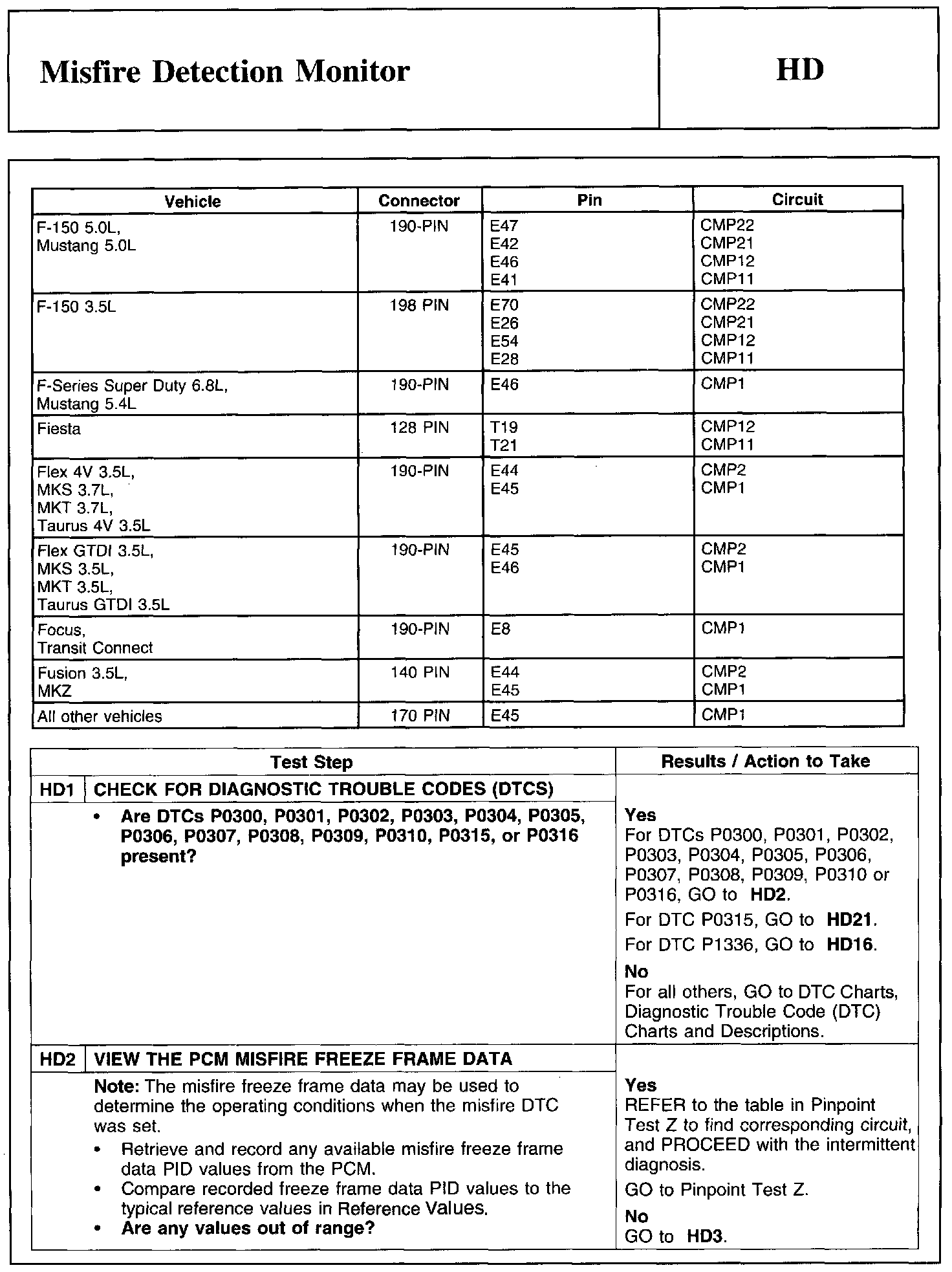Home >> Ford >> 2011 >> Edge AWD V6-3.7L >> Repair and Diagnosis >> Powertrain Management >> Computers and Control Systems >> Testing and Inspection >> Pinpoint Tests >> Test HD: Misfire Detection Monitor