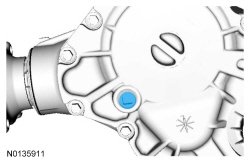 6. Remove the filler plug. Using an Oil Suction Gun 303-D104 (D94T-9000-A), remove as much fluid as possible from the PTU (Power Transfer Unit).