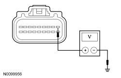 - Measure the voltage between the C-CM (Cruise-Control Module) C1582-1, circuit SBB79 (WH/RD), harness side and ground.