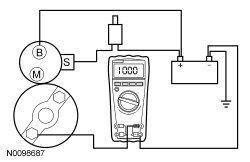 7. Remove the cables from solenoid "B" "S" and "M" terminals. Clean the cables and connections and reinstall the cables to the correct terminals. Repeat Steps 3 through 6. If the voltage drop reading is still greater than 0.5 volt when checked at the "M" terminal or less than 0.5 volt when checked at the "B" terminal, the concern is in the solenoid contacts. Install a new starter motor.