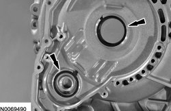56. NOTICE: Make sure the sealing surface of both the transaxle case and the torque converter housing are clean, dry and free of oil or the silicone will not seal the transaxle case.