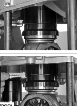 30. Using a feeler gauge, measure and record the smallest and largest preload gap on the Differential/Transfer Gear Bearing Shim Gauge 307-591/1 placed on the differential assembly. Add the 2 measurements and divide by 2. This is the thickness of the differential bearing preload shim. For additional information, refer to Specifications for the differential bearing preload shim part number.