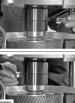 33. Remove the Differential/Transfer Gear Bearing Shim Gauge 307-591/3 (4 spacers) from the transaxle case.