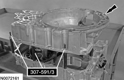 34. Remove the Differential/Transfer Gear Bearing Shim Gauge 307-591/3 (4 studs) from the transaxle case.