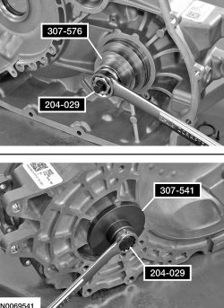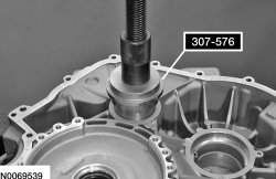 48. Using the Bearing Cup Installer 307-576, Transfer Gear Bearing Installer 307-541 and the Drawbar 204-029, press the differential bearing cup in the torque converter housing.