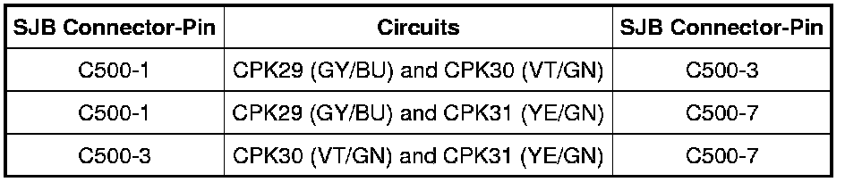 - Measure the resistance between the SJB, harness side as follows: