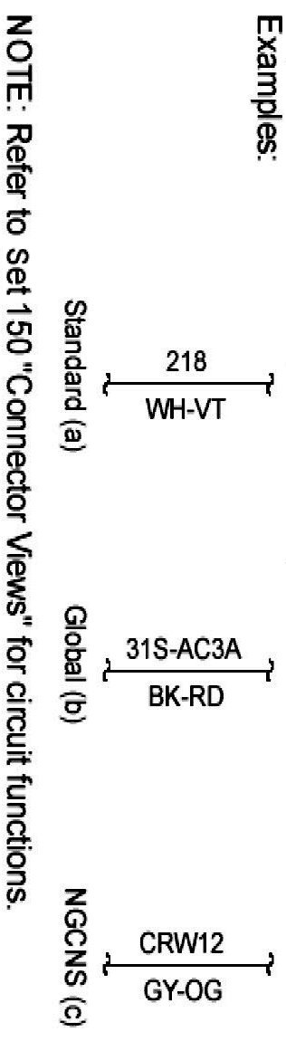 Connector Views show the views of the pins and/or cavities of all connectors. The pin and cavity sides are shown separately as if the connector were disconnected. The color of the connector housing is indicated next to the connector number when available. The harness causal number is located above the connector view and below the connector number. The circuit function charts are located below each connector. The wiring harness designations are listed in Component Location Charts.