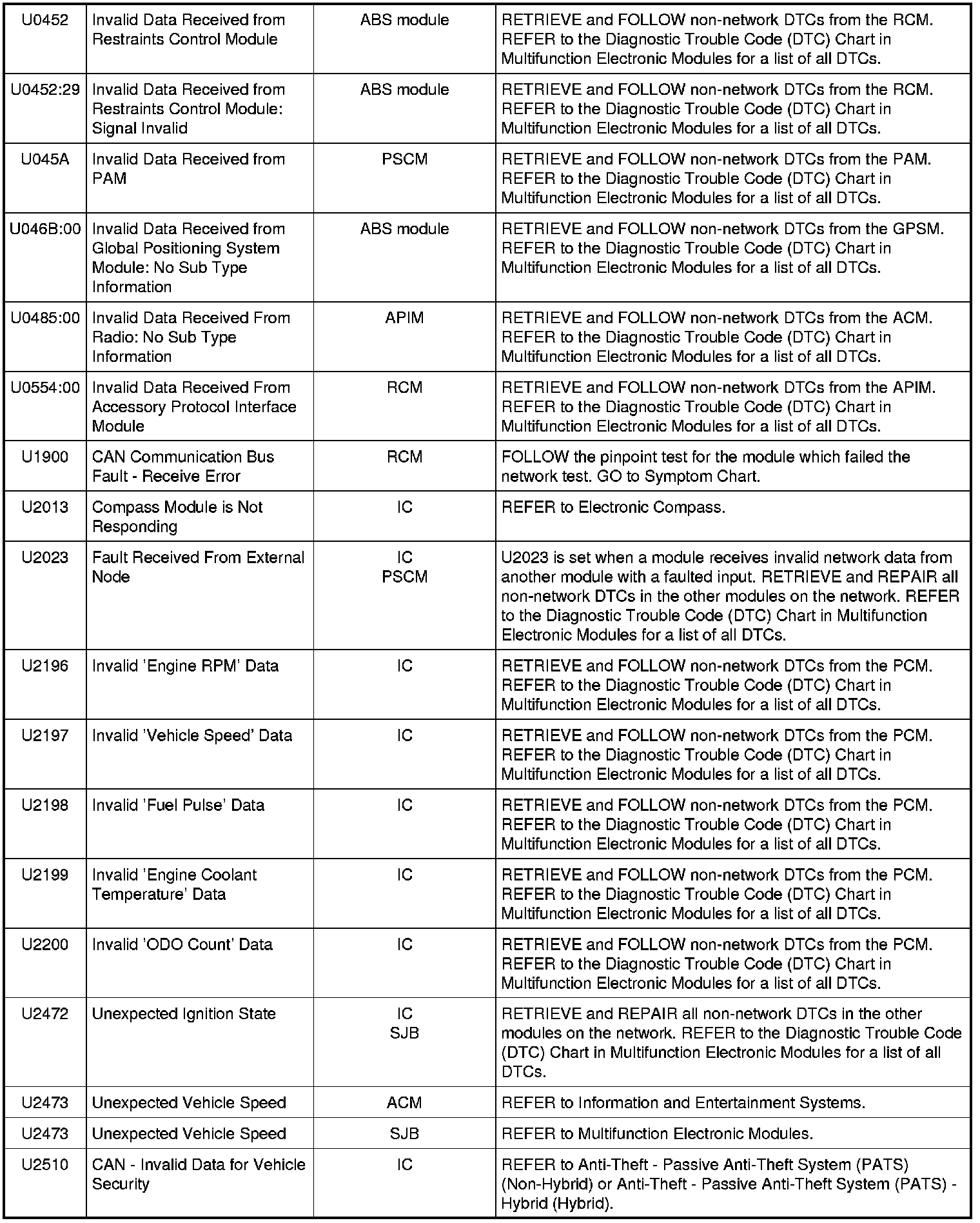 NOTE: Network DTCs (U-codes) are often a result of intermittent concerns such as damaged wiring or low battery voltage occurrences. Additionally, vehicle repair procedures such as module reprogramming often set network DTCs. Replacing a module to resolve a network DTC is unlikely to resolve the concern. To prevent repeat network DTC concerns, inspect all network wiring, especially connectors. Test the vehicle battery, refer to Battery, Mounting and Cables Testing and Inspection.