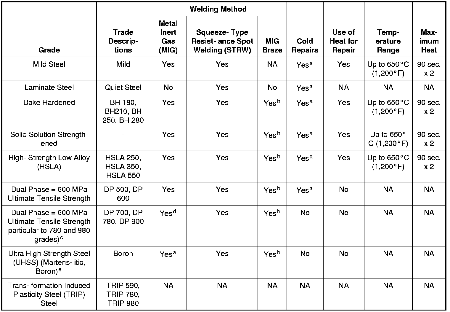 Ford Recommended Steel Repairability Matrix