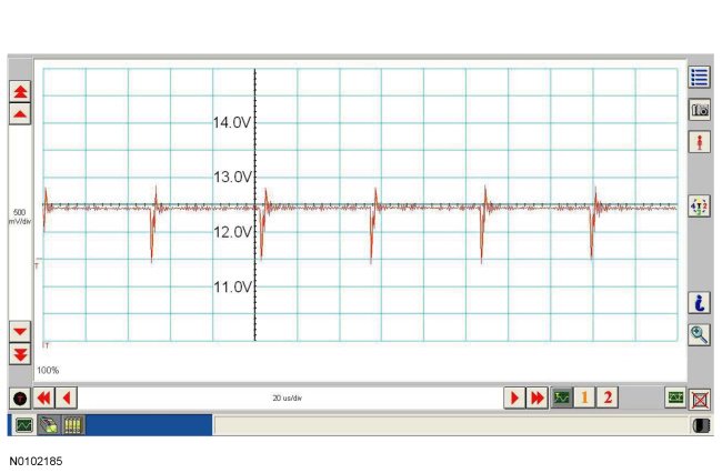 Traces below are viewed at 500mV per division (vertical axis) and 20 microseconds (20µs) per division (horizontal axis). Readings taken with a different oscilloscope vary from those shown. Compare any suspect readings to a known good vehicle.