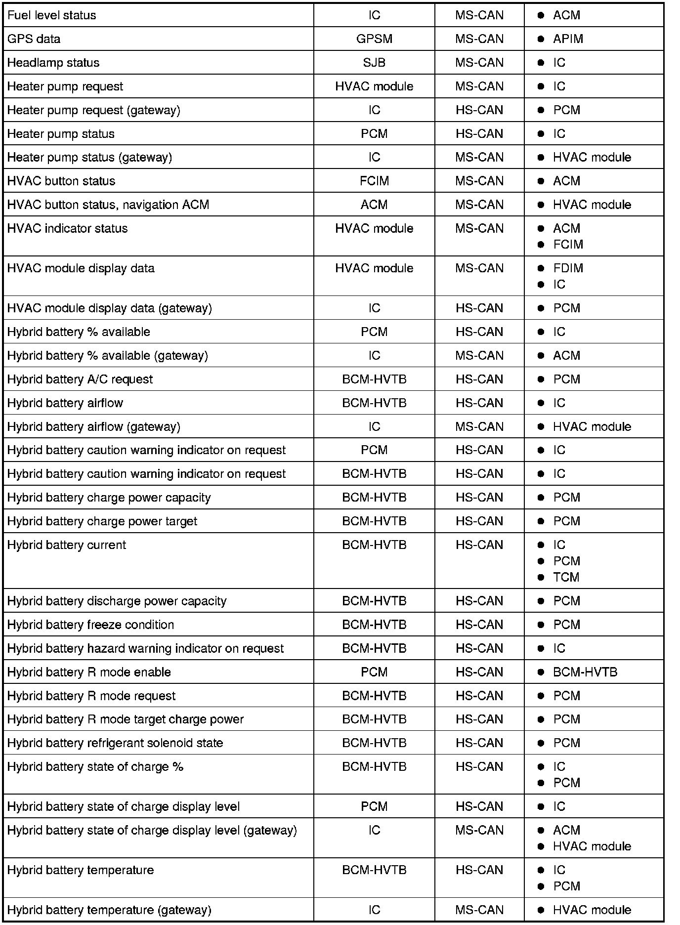 Modules on the CAN utilize simultaneous communication of 2 or more messages on the same network circuits. The following chart summarizes the messages sent and received on the network.