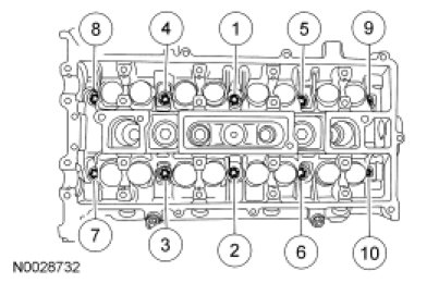 Install the camshafts and bearing caps in their original locations and orientation. Tighten the bearing caps in the sequence shown in 3 stages: