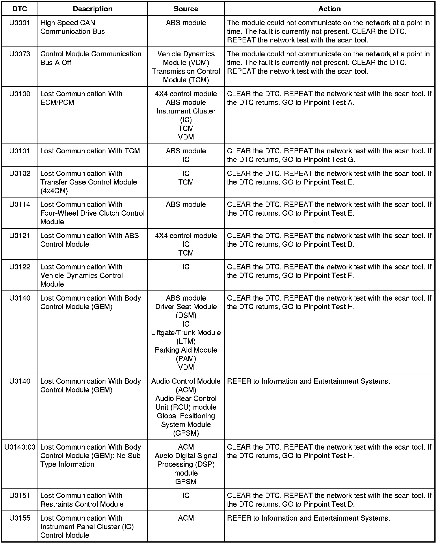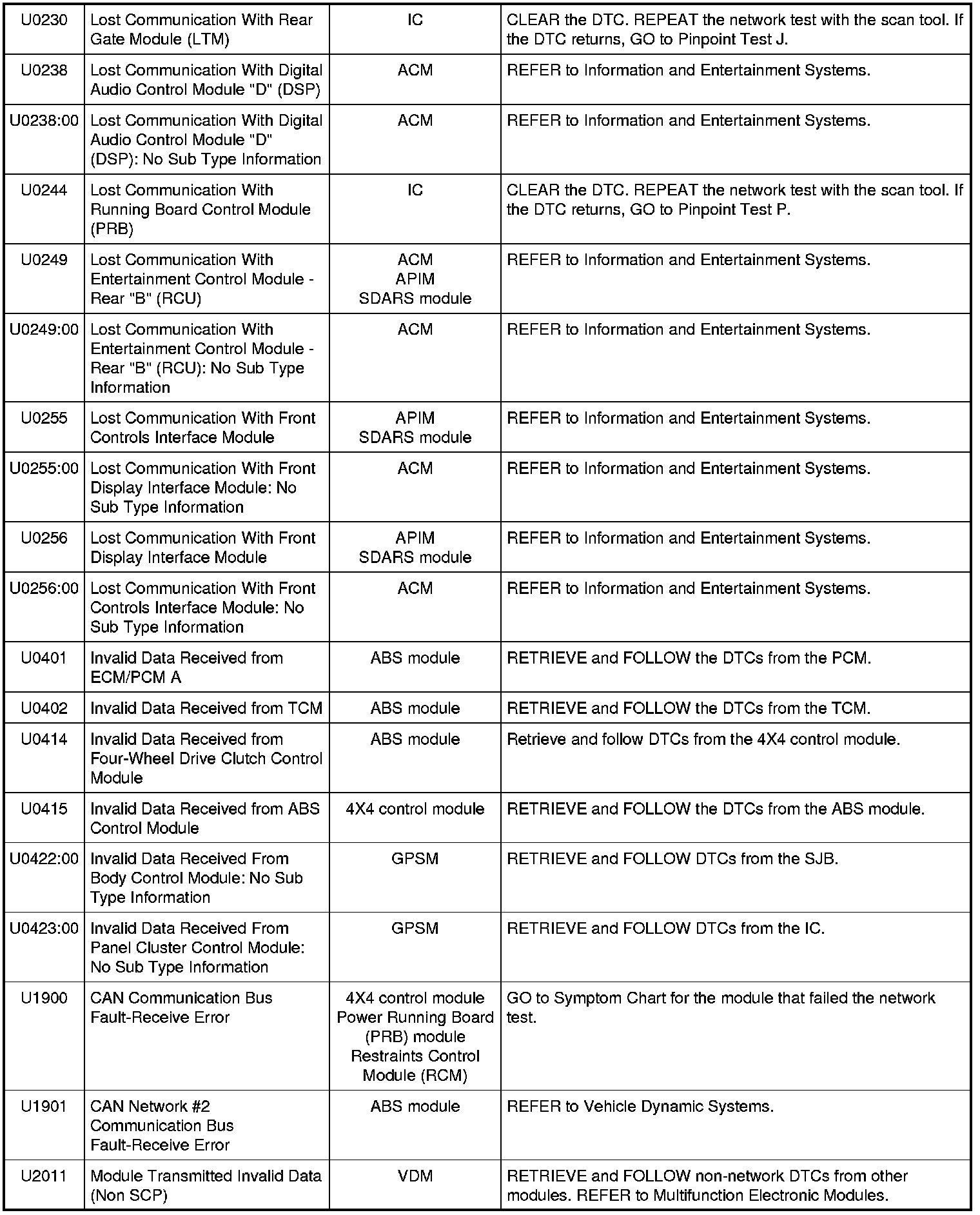 NOTE: Network DTCs (U-codes) are often a result of intermittent concerns such as damaged wiring or low battery voltage occurrences. Additionally, vehicle repair procedures such as module reprogramming often set network DTCs. Replacing a module to resolve a network DTC is unlikely to resolve the concern. To prevent repeat network DTC concerns, inspect all network wiring, especially connectors. Test the vehicle battery, refer to Battery, Mounting and Cables Testing and Inspection.