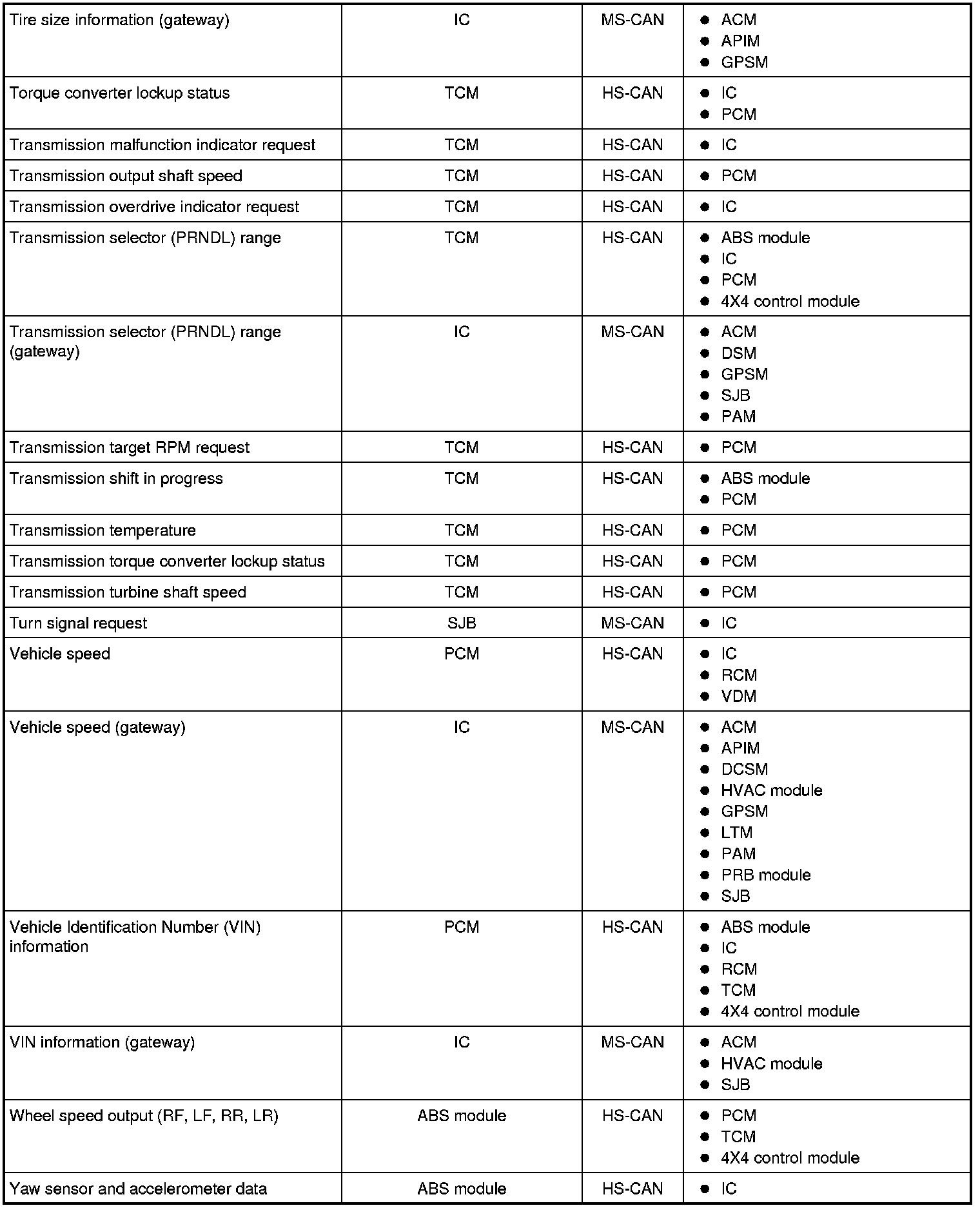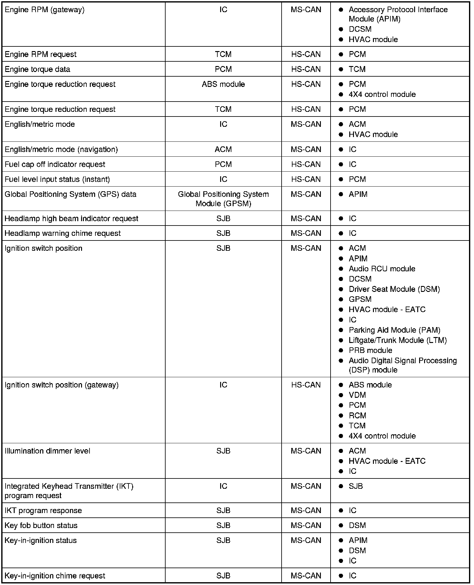 NOTE: This chart describes the specific HS-CAN and MS-CAN messages broadcast by each module, and the module(s) that receive the message.