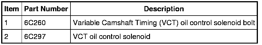 2. Remove the bolt and the Variable Camshaft Timing (VCT) oil control solenoid.